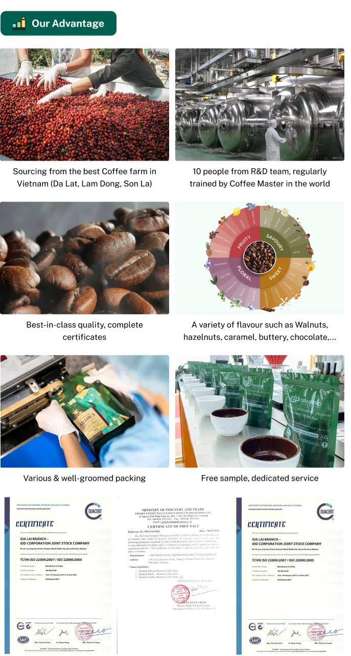 Specifications | + Moisture: 12.5% max+ Foreign matter: 0.1% + Broken beans: 0.5% + Black bean: 0.5% + Packing: jute bag (net 60kg) | ||||