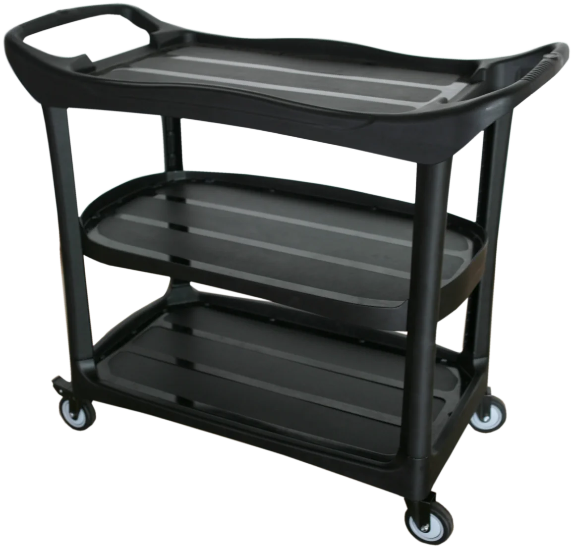 For a long service life, the Rubbermaid FG9T7400BLA high-capacity janitorial cleaning cart is made of aluminum and structural web plastic and finished with a water- and chemical-resistant material. Equipped with two 8-inch ball-bearing wheels and two 4-inch casters, the cart can swivel fully to turn sharp corners. Users can push the cart comfortably with its ergonomic handle, which is interchangeable to accommodate operator needs. Its platform also can be removed to minimize its footprint, making it versatile enough to be used in small spaces. Overall, this unit measures 48.25 inches long by 22 inches wide by 44 inches high.