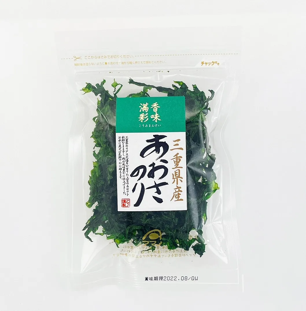 "Aosa Nori from Mie Prefecture" is a popular brand product in Japan. "Aosa Nori" is characterized by the scent of rocky shore and the soft texture. It is a natural food that contains a lot of dietary fiber and calcium and has high health effects without coloring and additives. The green color of the sea lettuce seaweed complements the dishes.