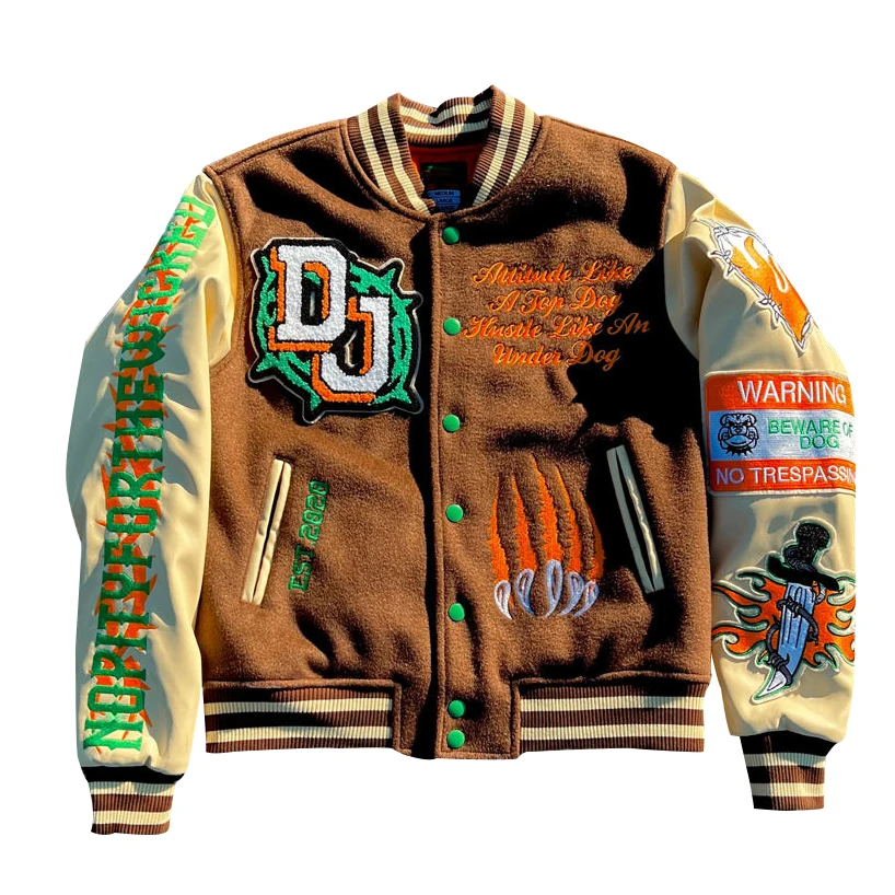 Нашивка с вышитыми буквами на заказ кожаная куртка рукавами для колледжа коричневая шерстяная куртка-бомбер бейсбола