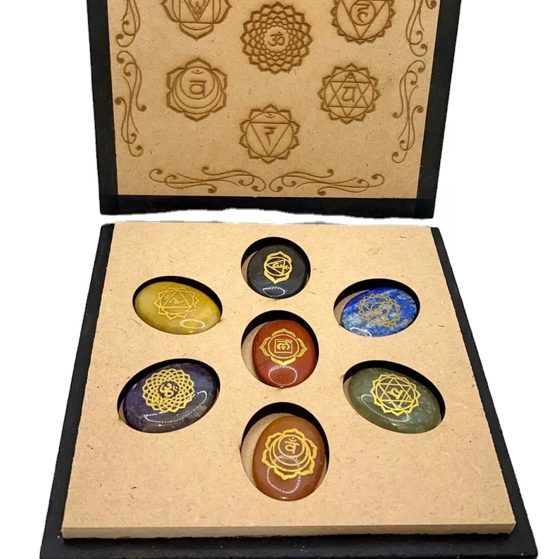 Заводская цена натуральный Овальный набор 7 чакр с гравировкой диска в коробке для лечения и медитации из Индии