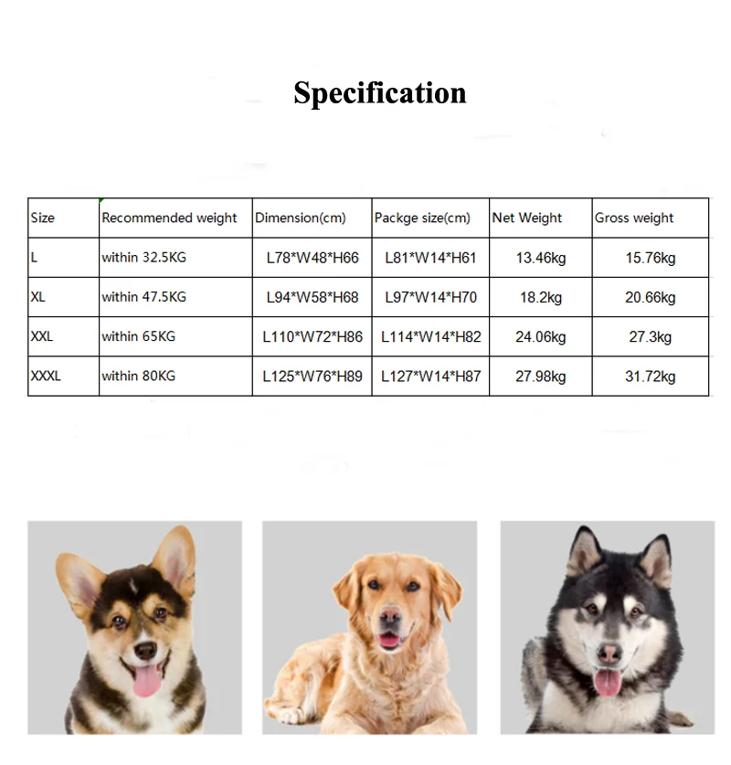 Kennel Size | L78*W48*H66 L size; L94*W58*H68 XL Size; L110*W72*H86 XXL Size; L125*W76*H89 XXXL | ||||||