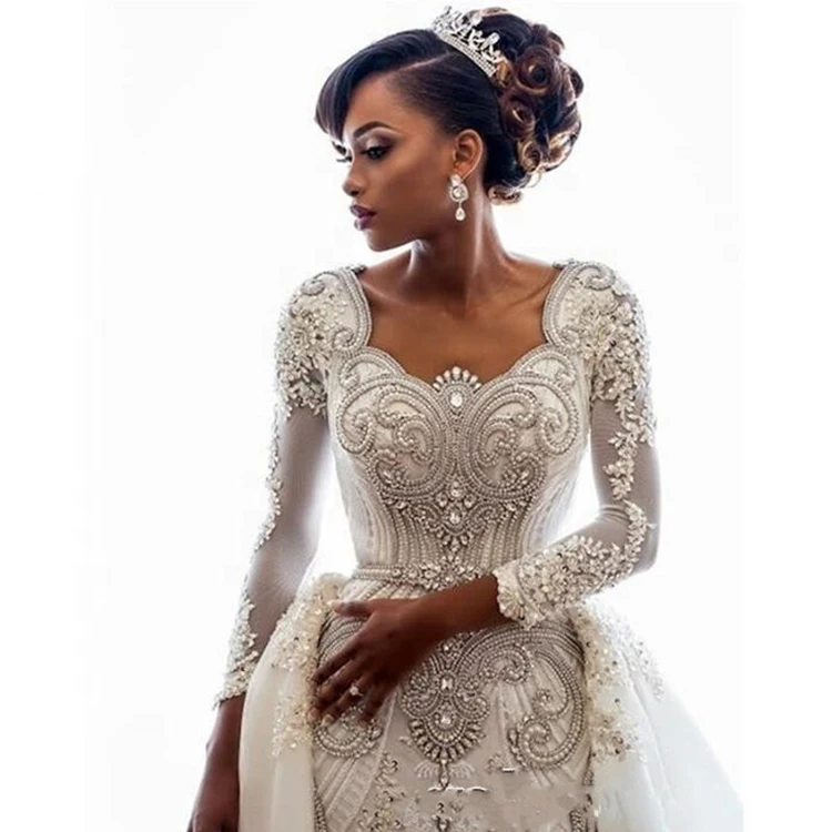 Фабричное роскошное свадебное платье с бисером, с длинным рукавом, свадебное платье Сакси-силуэта русалки, свадебные платья со съемным хвостом, женские платья