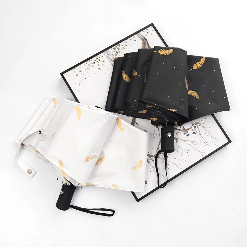 Заводская подгонка 8K 3 складывающиеся автоматические УФ стильные перья из золотой фольги портативные ветрозащитные зонтики для защиты от дождя от солнца с логотипом