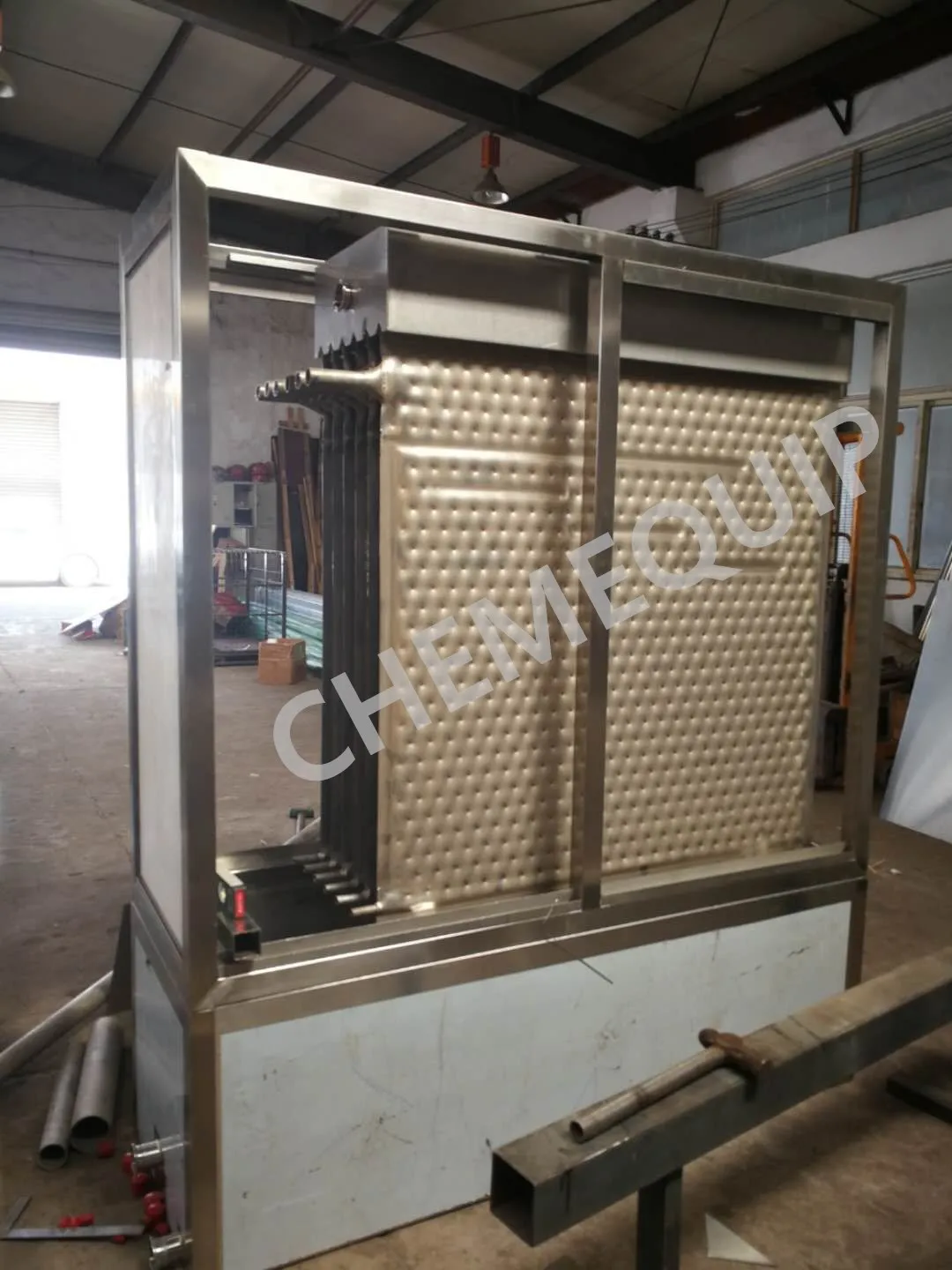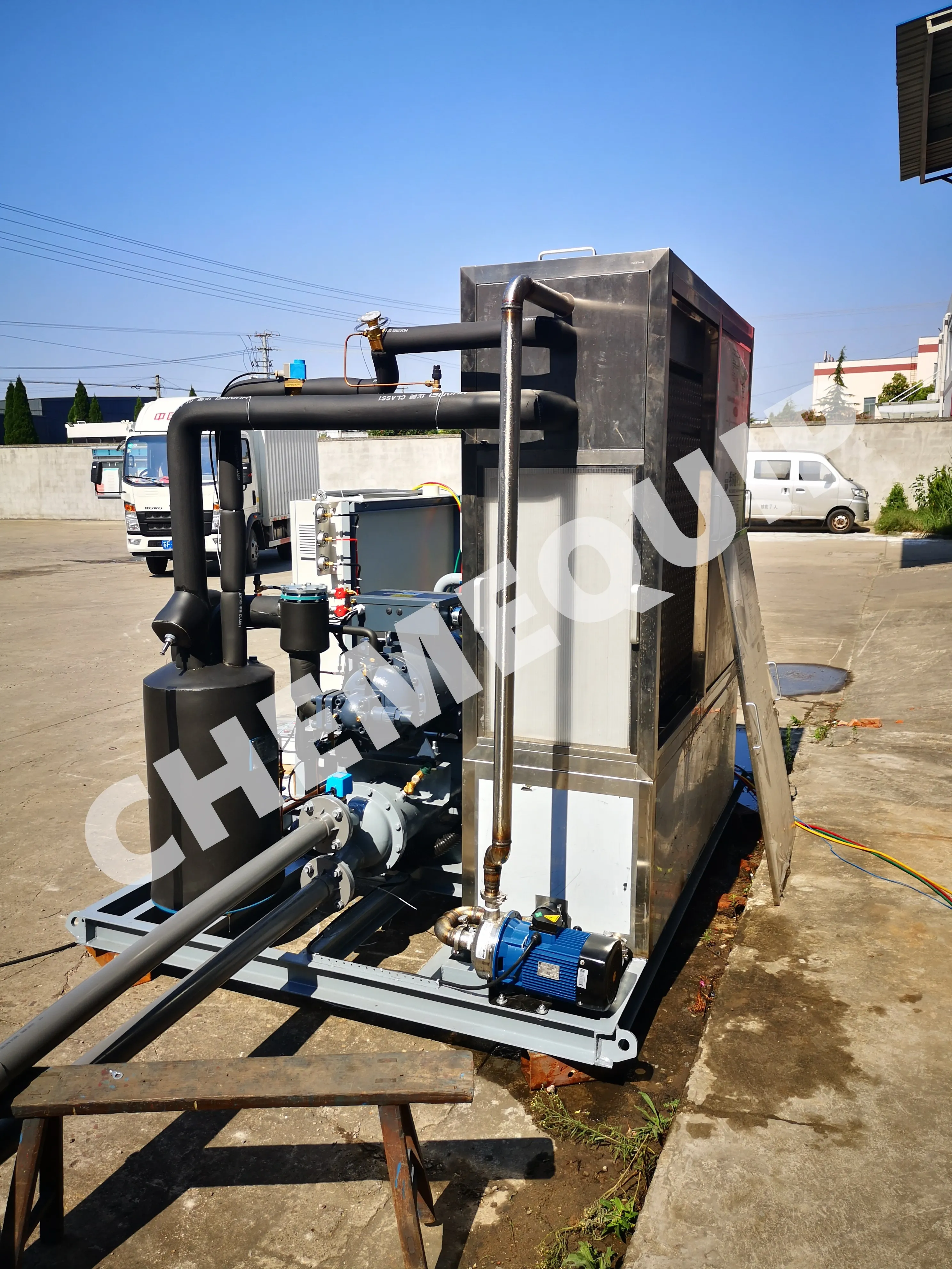 A Falling Film Chiller is a heat exchanger that cools water to your desired temperature. This cold water is used to cool large quantities of product in a short amount of time, for example, to blanch vegetables or to mix with concrete to prevent the concrete from drying too quickly. You can also choose to recirculate the water and let Laser Plates cool the water down again to the right temperature. With this recirculating Falling Film Chiller your products are continuously cooled to an even temperature.