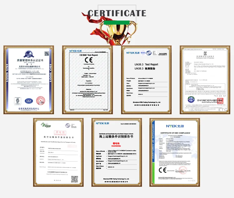 A: If required, we could apply CE, ROHS, CB(IEC62133), UL, KC, PSE, BIS, UN38.3 etc.