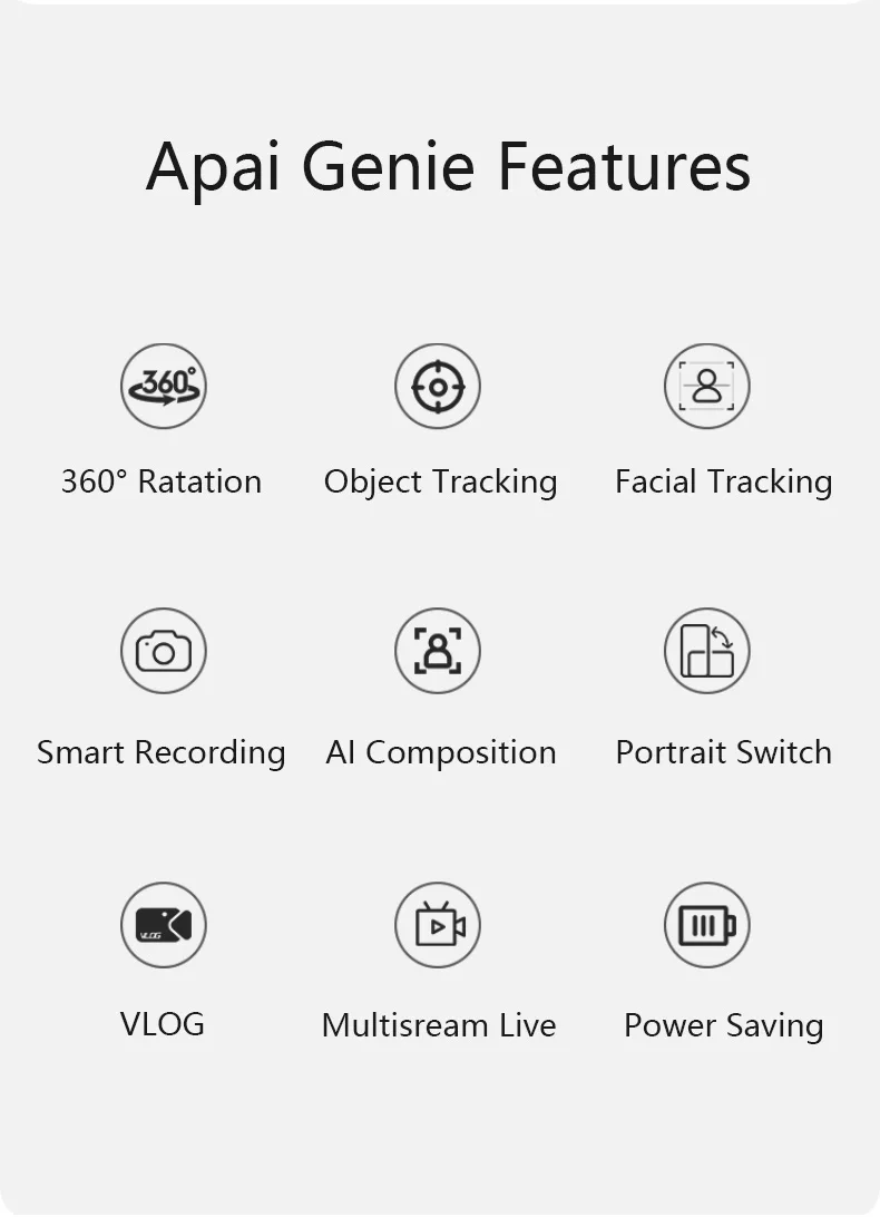 Description Product Name : Apai Genier - The smart personal Robot-Cameraman App support : Apai Genie Product Funtion ★Object tracking mode, ★Face tracking mode, ★ Video Call ★Multi-stream live ★Support for tripod mounting Net weight 400g Size 102*102*178mm (L x W x H) Power supply 1.5v No. 5 alkaline dry battery*3 Support system: iOS & Andriod