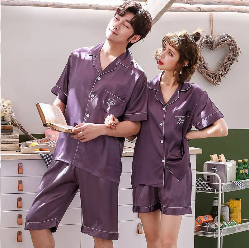 Пижама шелковая для пар, кардиган с коротким рукавом и V-образным вырезом, домашняя одежда, Шелковый костюм