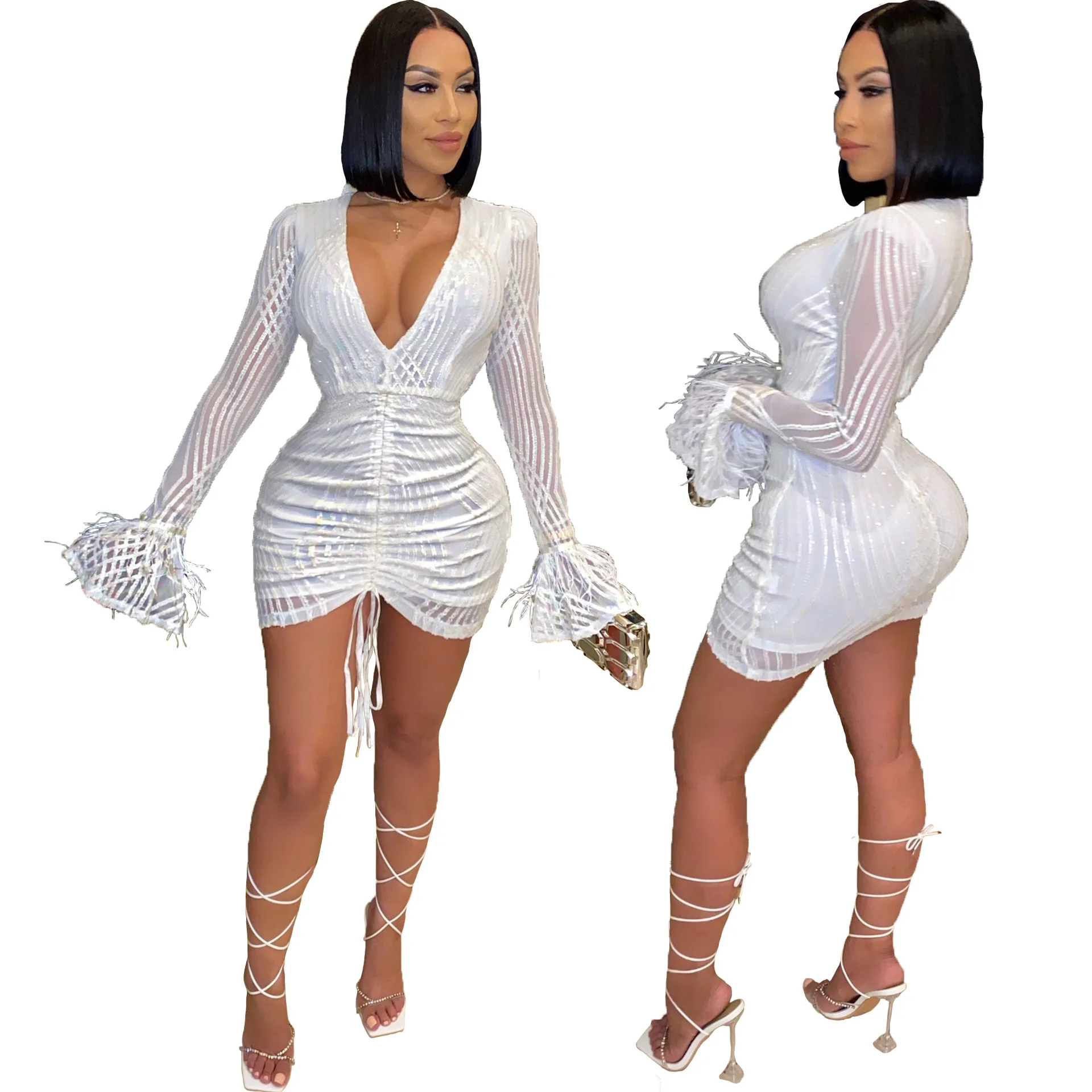 Вязаное платье-свитер, женская одежда, платье с глубоким v-образным вырезом и оборками, весна-осень, платье с длинными рукавами
