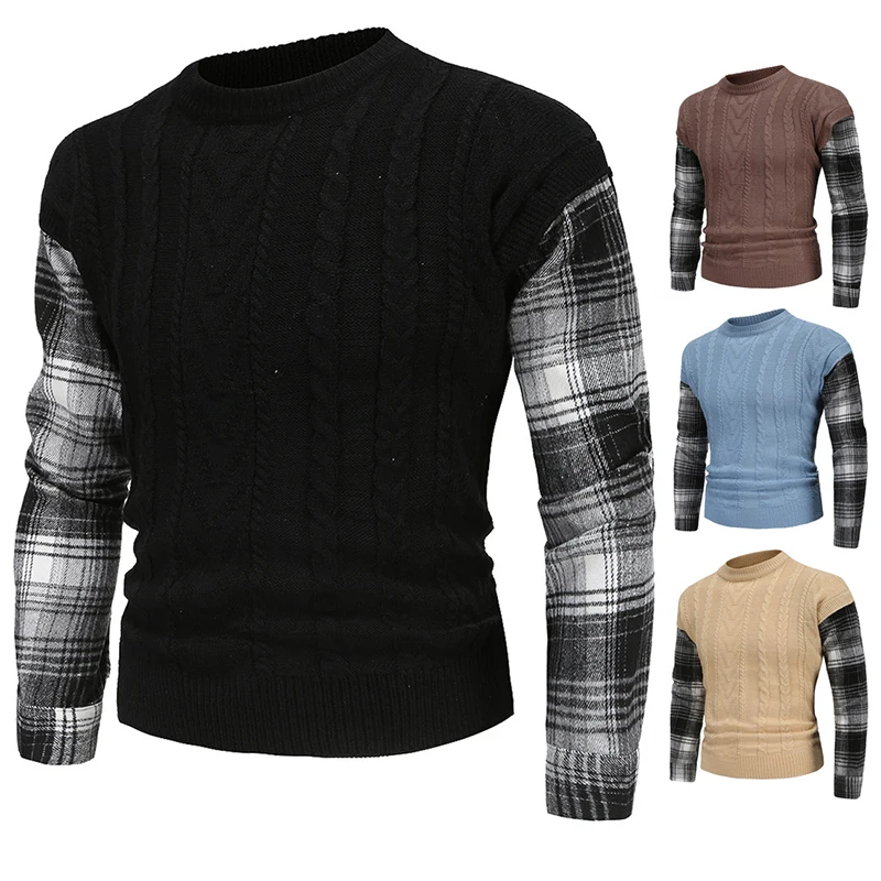 Современные мужские повседневные облегающие базовые свитера, вязаный теплый комбинированный клетчатый пуловер, свитер