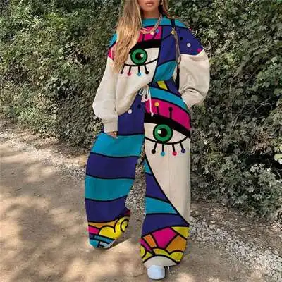 2021; Сезон осень-зима комплект из 2 частей для женщин плюс размер брюки для девочек с принтом абстрактных Женская одежда из двух предметов, комплект со штанами