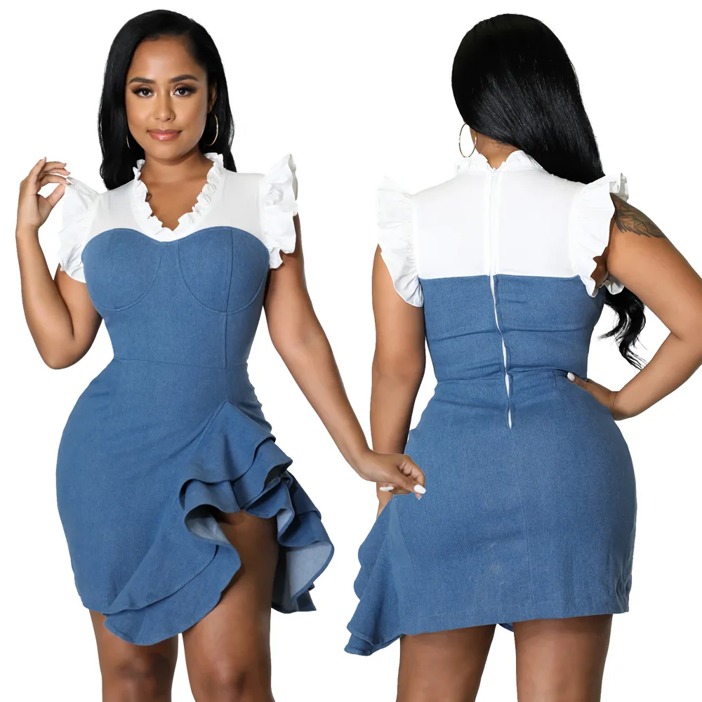 Двухслойное облегающее женское джинсовое платье C0302SW10 с оборками на рукавах по оптовой цене