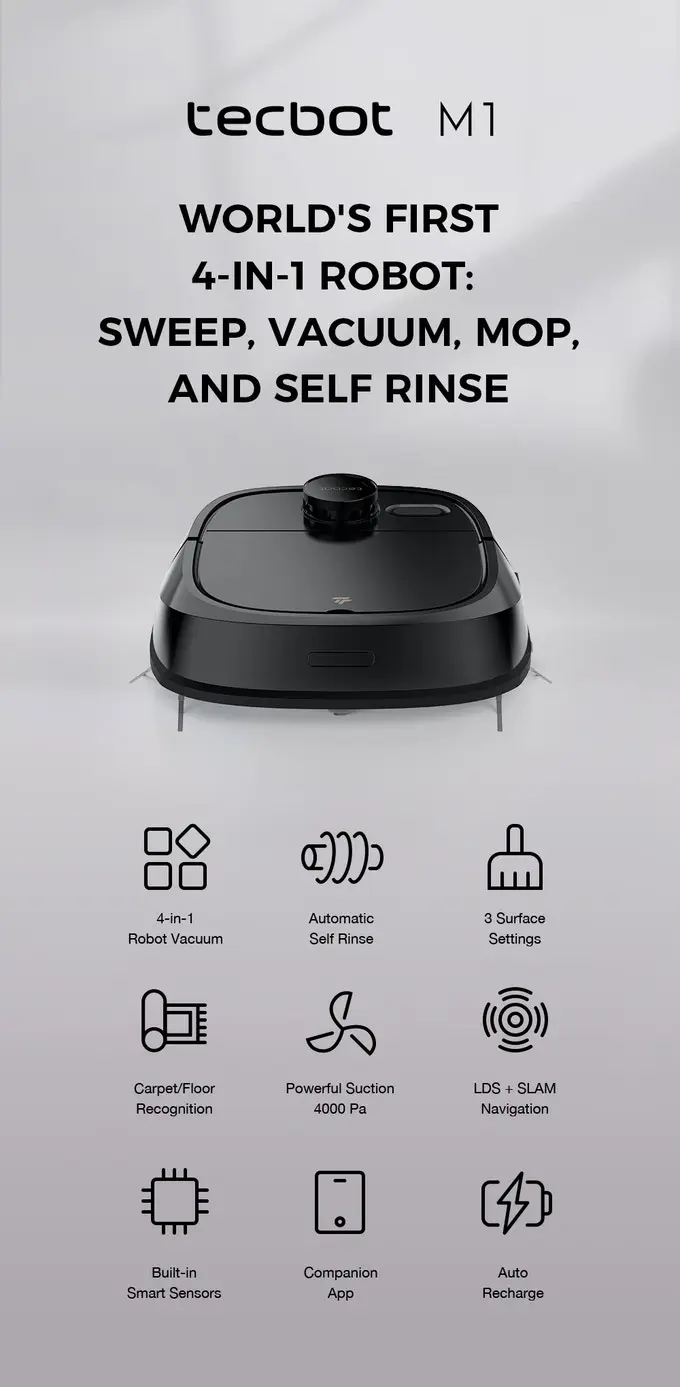 Features:Make cleaning easier with TECBOT M1. Our revolutionary 4-in-1 technology provides vacuum, sweep, mop, and self-rinse functions in one innovative robot. At the touch of a button, TECBOT M1 does it all. Simple, automatic, and convenient.