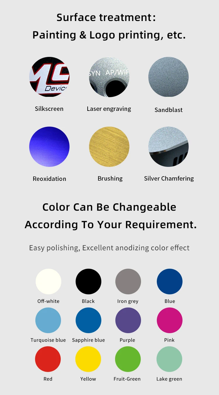 Surface treatment | Can be customized, such as Brush, sandblast, anodize, silk-screen print etc. |