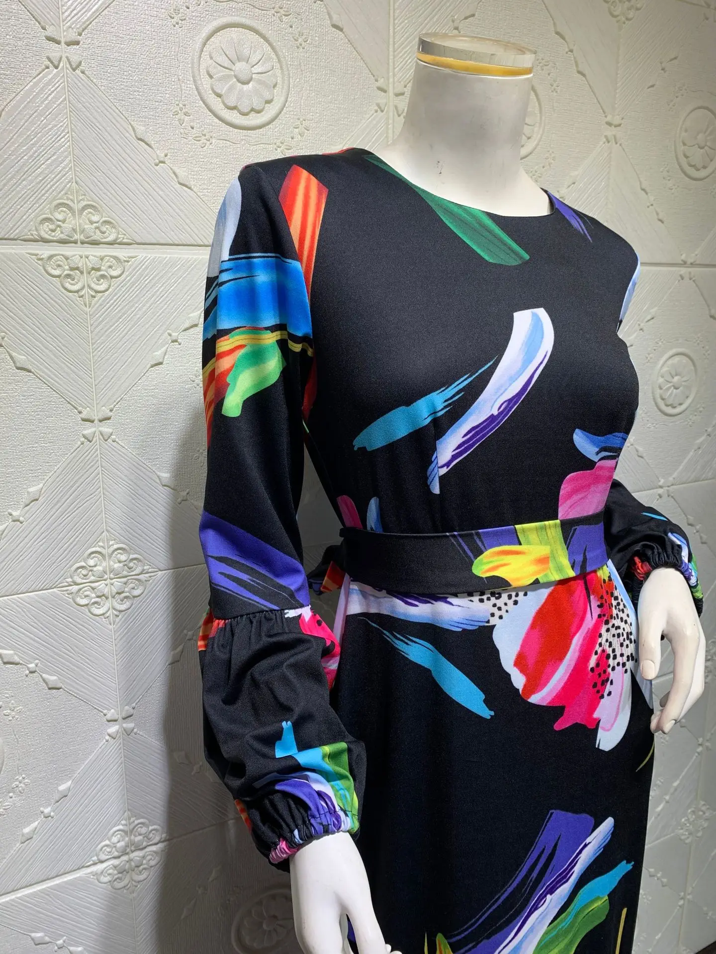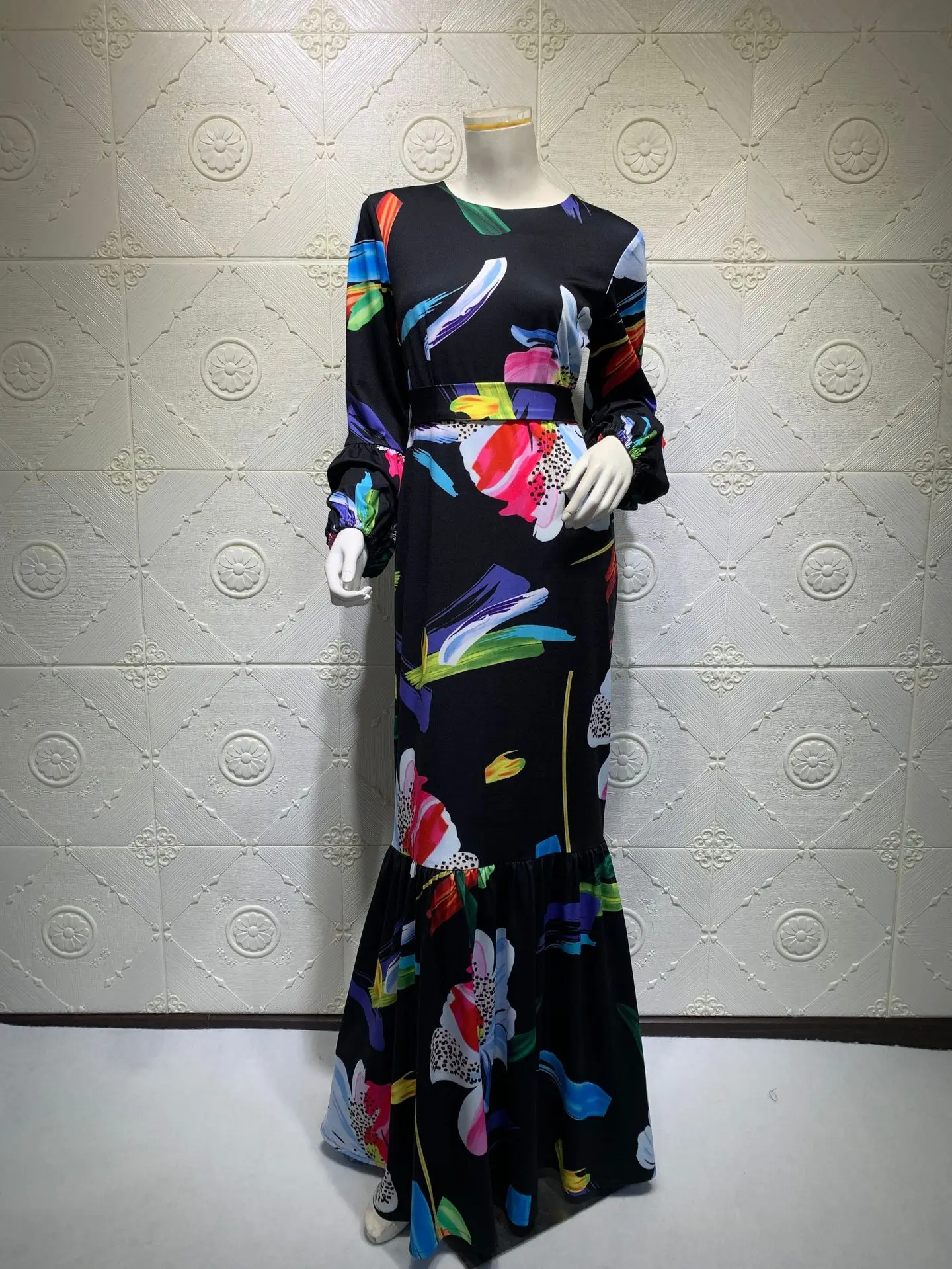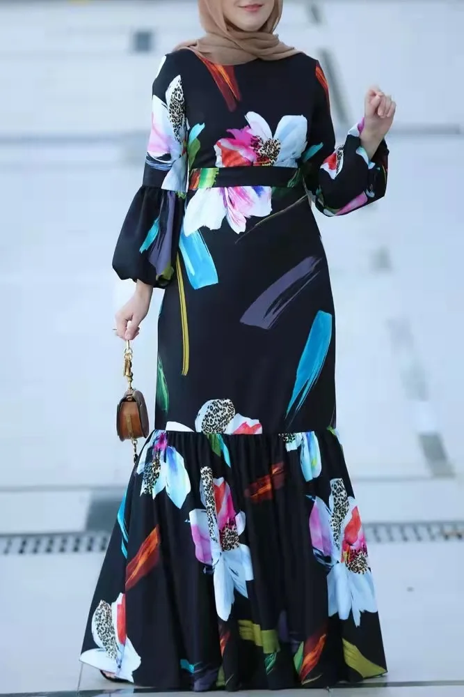 Name | Dubai Turkey Islam Women Clothing Fashion Satin Printed Long Sleeve Muslim Maxi Dress |