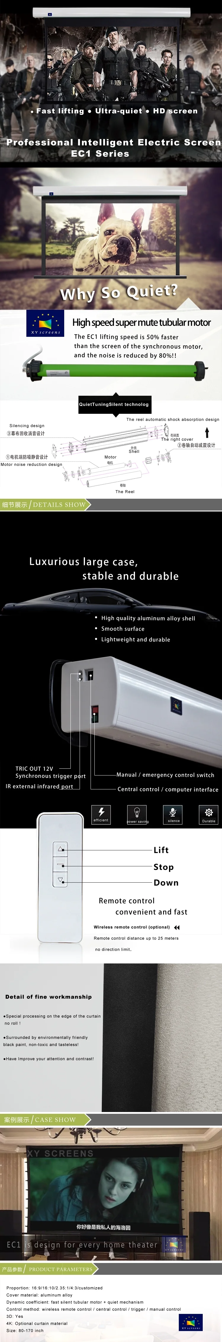 With a breakthrough design concept and configuration, EC1 has very high quality and standard; a number of patent and mute technology have been used, showing the new trend of top screen technology to the public. Equipped with super mute tube motor and QUIETTUNING mute technology, the lifting speed of EC1 is 50% faster than synchronous motor screen. What’s more, the noise is decreased by 80%.