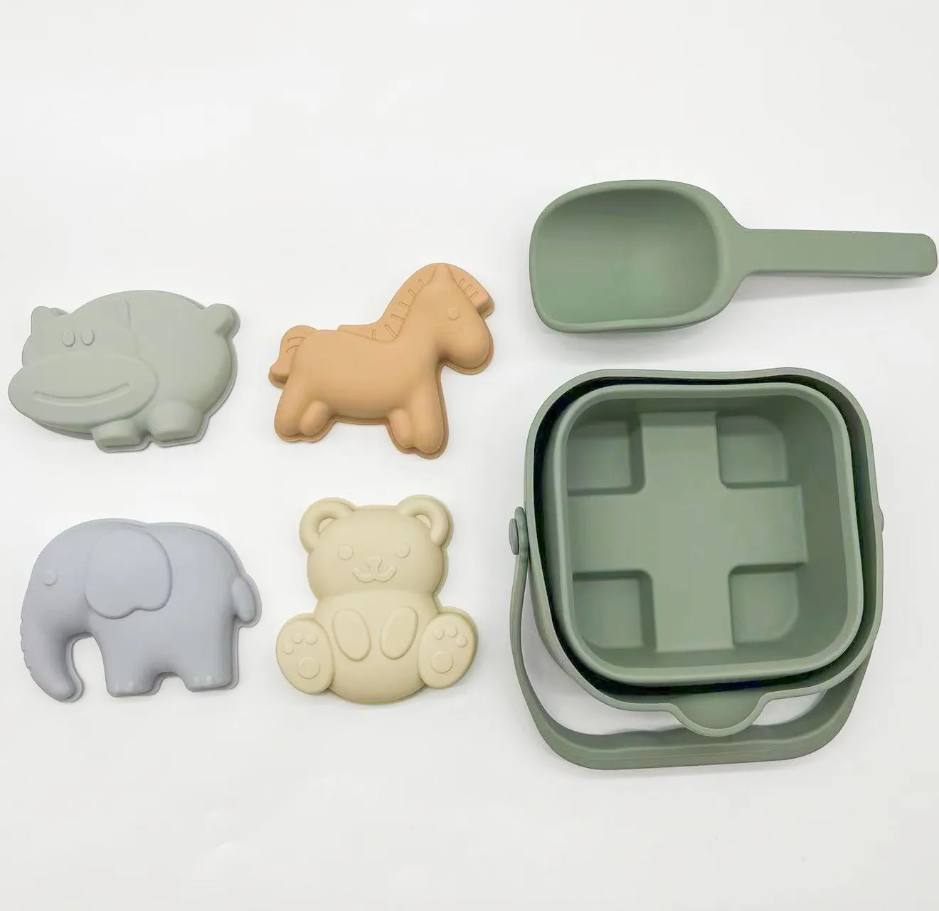 Hardness | The bucket is 60 shore silicone, shovel is 80 shore silicone, animal shapes is 70 shore silicone |