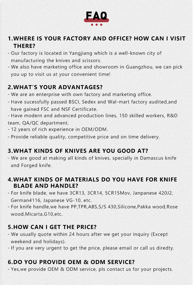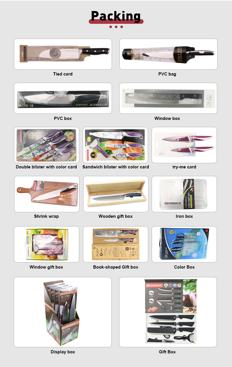 | Surface Treatment | non-stick blade,black oxide blade,stonewash blade,laser light blade,decal printing blade,PVD coating blade,laser engraving blade,embossed blade,etc. |