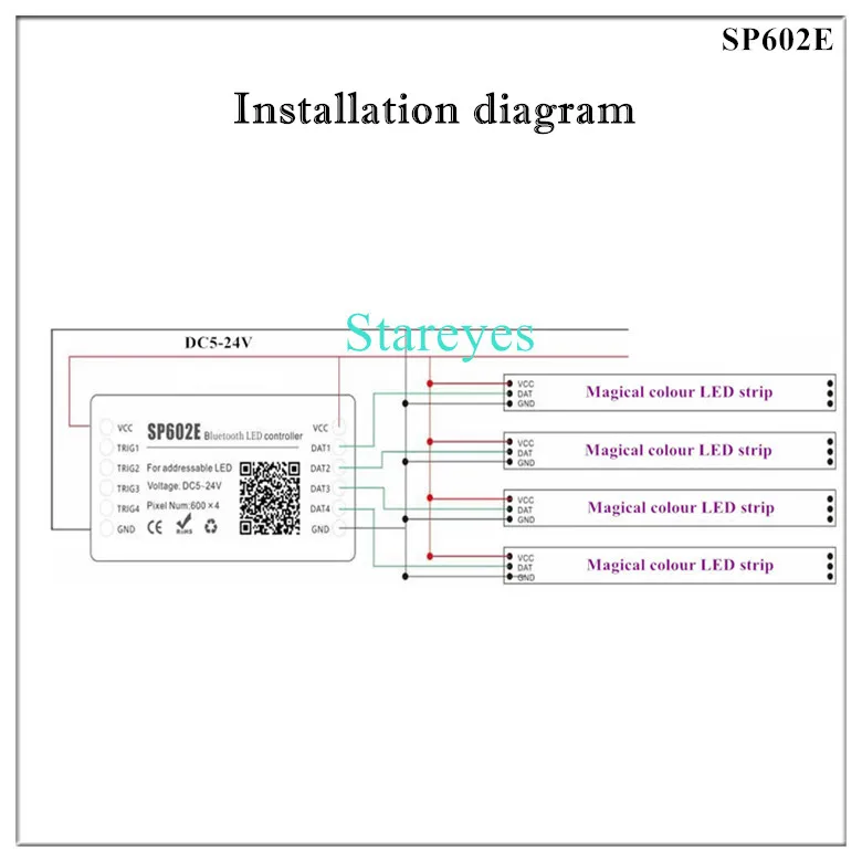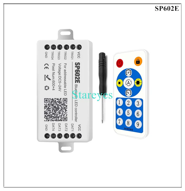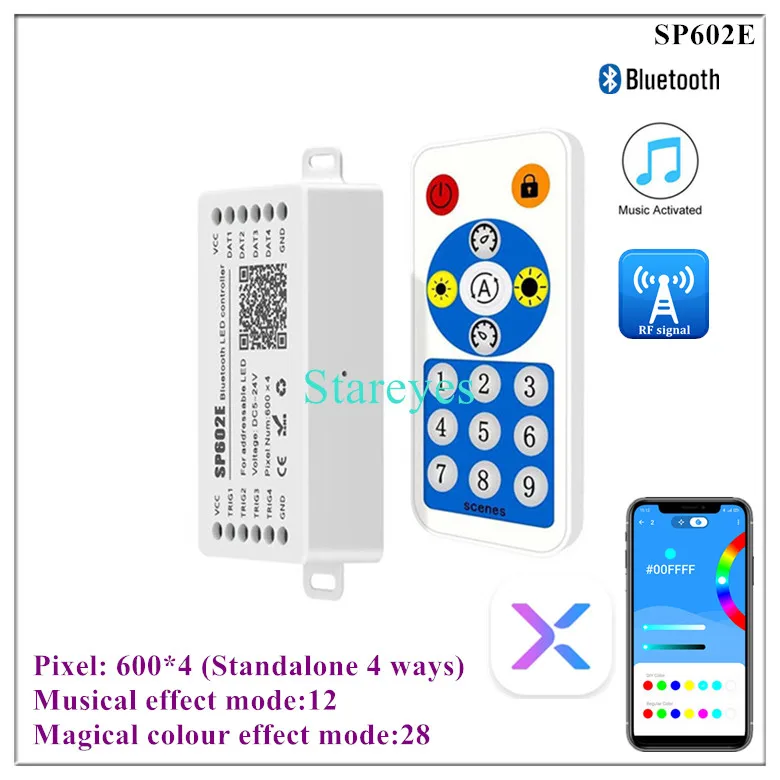 SP602E specifications: Control Method: RF Remote / APP (Bluetooth) Input port: DC female connector Input Voltage: DC5-24V Maximum current: 5.0A Pixel: 600*4 Music activated mode: Built-in microphone / AUX IN Magical colour effect mode: 12+28 Output port: 4 (Standalone 4 ways, Can independently control the color of each way) Connector: 3Pin Support IC: WS2811 WS2812B WS2813 WS2815 WS2818 WS2801 SK6812 P943S P9411 P9413 TX1812 TX1813 SK6812-RGBW SM16703 UCS1903 TM1804 LPD6803 LPD8806 APA102 GS8206 GS8208 SK9822 P9414 P9412 TM1814 TM1913 P9813 APA105