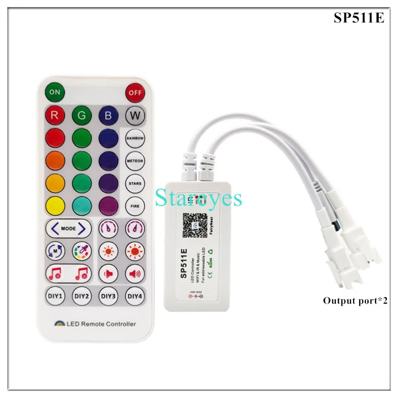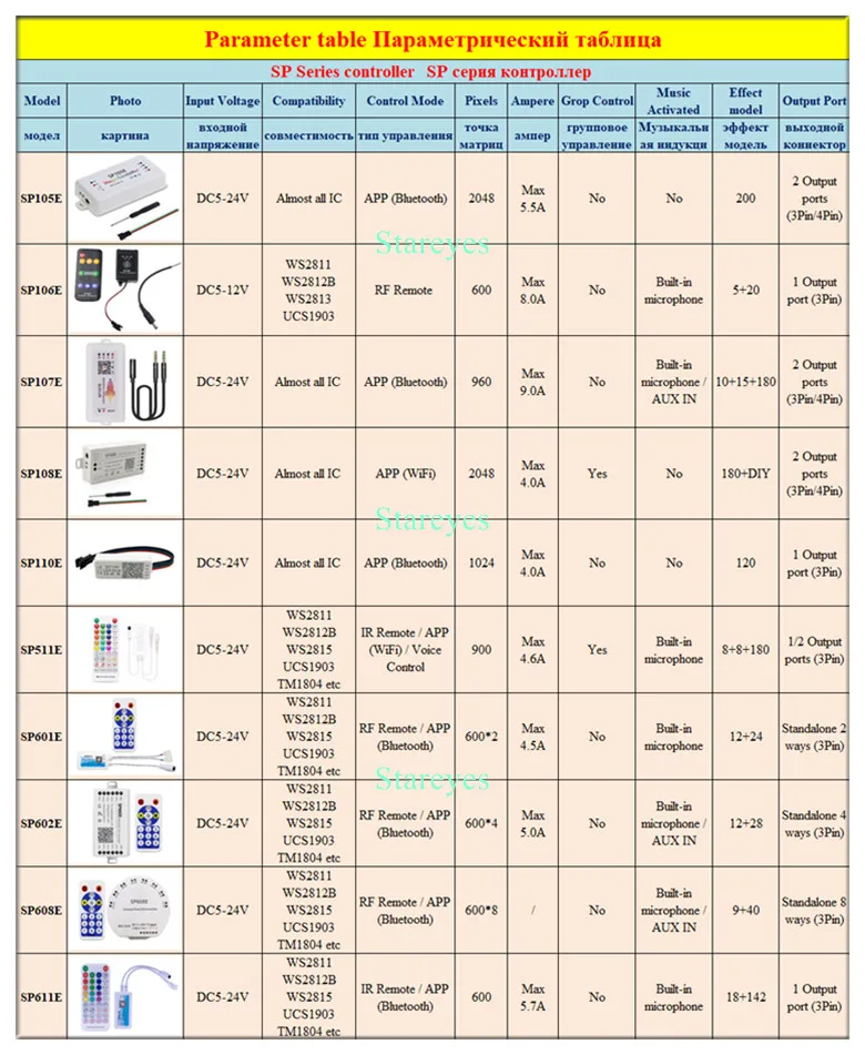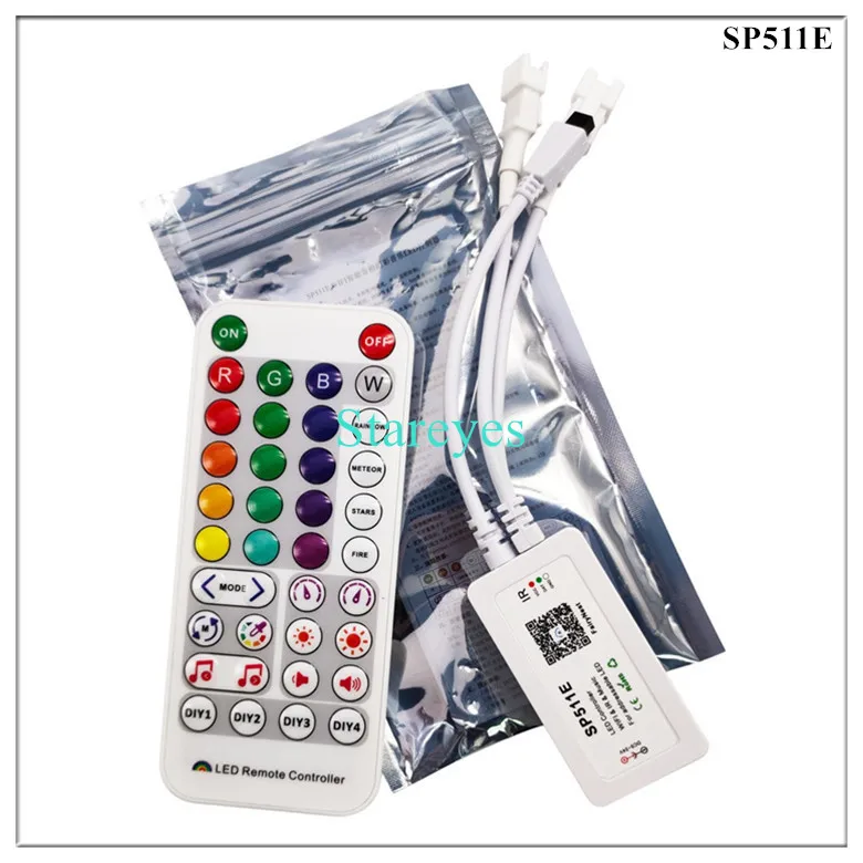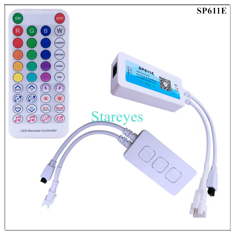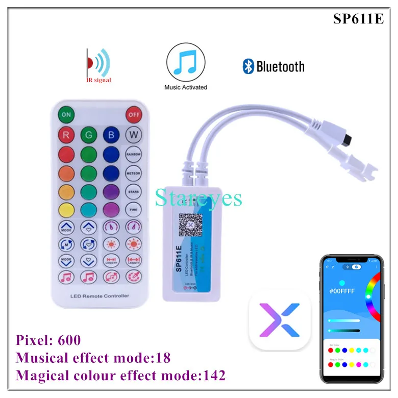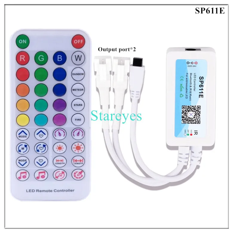 SP611E specifications: Control Method: IR Remote / APP (Bluetooth) Input port: DC female connector Input Voltage: DC5-24V Maximum current: 5.7A Pixel: 600 Music activated mode: Built-in microphone / AUX IN Magical colour effect mode: 18+142 Output port: 1 / 2 Connector: 3Pin Support IC: WS2811 WS2812B WS2813 WS2815 WS2818 WS2801 SK6812 P943S P9411 P9413 TX1812 TX1813 SK6812-RGBW SM16703 UCS1903 TM1804 LPD6803 LPD8806 APA102 GS8206 GS8208 SK9822 P9414 P9412 TM1814 TM1913 P9813 APA105
