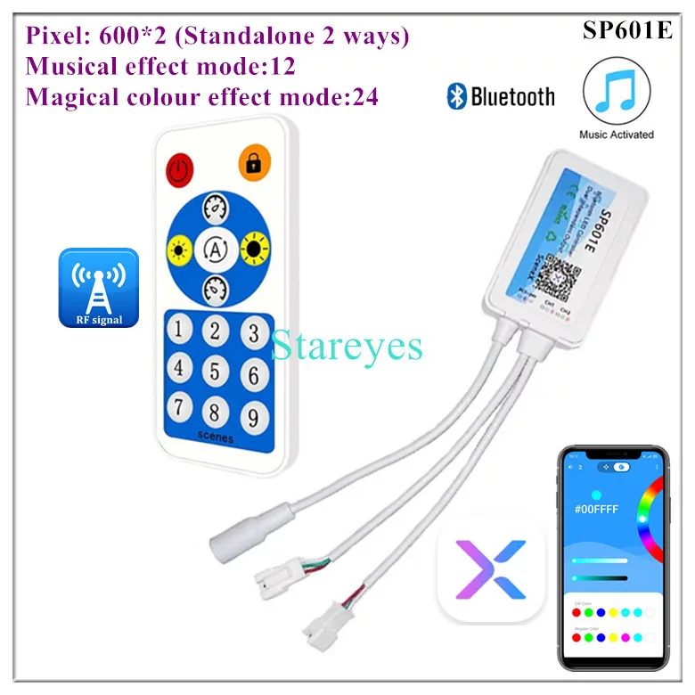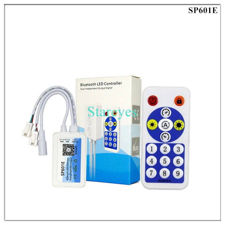 SP601E specifications: Control Method: RF Remote / APP (Bluetooth) Input port: DC female connector Input Voltage: DC5-24V Maximum current: 4.5A Pixel: 600*2 Music activated mode: Built-in microphone Magical colour effect mode: 12+24 Output port: 2 (Standalone 2 ways, Can independently control the color of each way) Connector: 3Pin Support IC: WS2811 WS2812B WS2813 WS2815 WS2818 WS2801 SK6812 P943S P9411 P9413 TX1812 TX1813 SK6812-RGBW SM16703 UCS1903 TM1804 LPD6803 LPD8806 APA102 GS8206 GS8208 SK9822 P9414 P9412 TM1814 TM1913 P9813 APA105