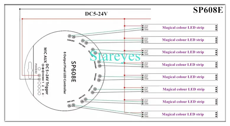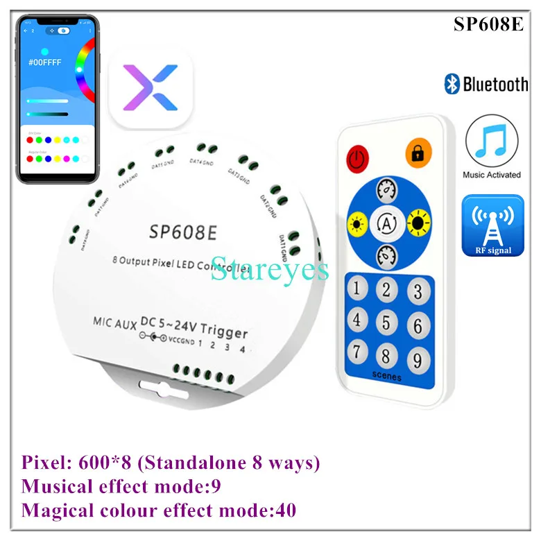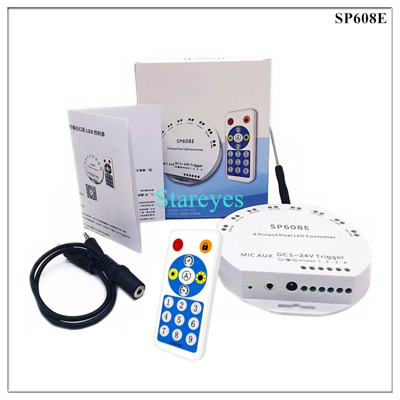 SP608E specifications: Control Method: RF Remote / APP (Bluetooth) Input port: DC female connector Input Voltage: DC5-24V Maximum current: / Pixel: 600*8 Music activated mode: Built-in microphone / AUX IN Magical colour effect mode: 9+40 Output port: 8 (Standalone 8 ways, Can independently control the color of each way) Connector: 3Pin Support IC: WS2811 WS2812B WS2813 WS2815 WS2818 WS2801 SK6812 P943S P9411 P9413 TX1812 TX1813 SK6812-RGBW SM16703 UCS1903 TM1804 LPD6803 LPD8806 APA102 GS8206 GS8208 SK9822 P9414 P9412 TM1814 TM1913 P9813 APA105
