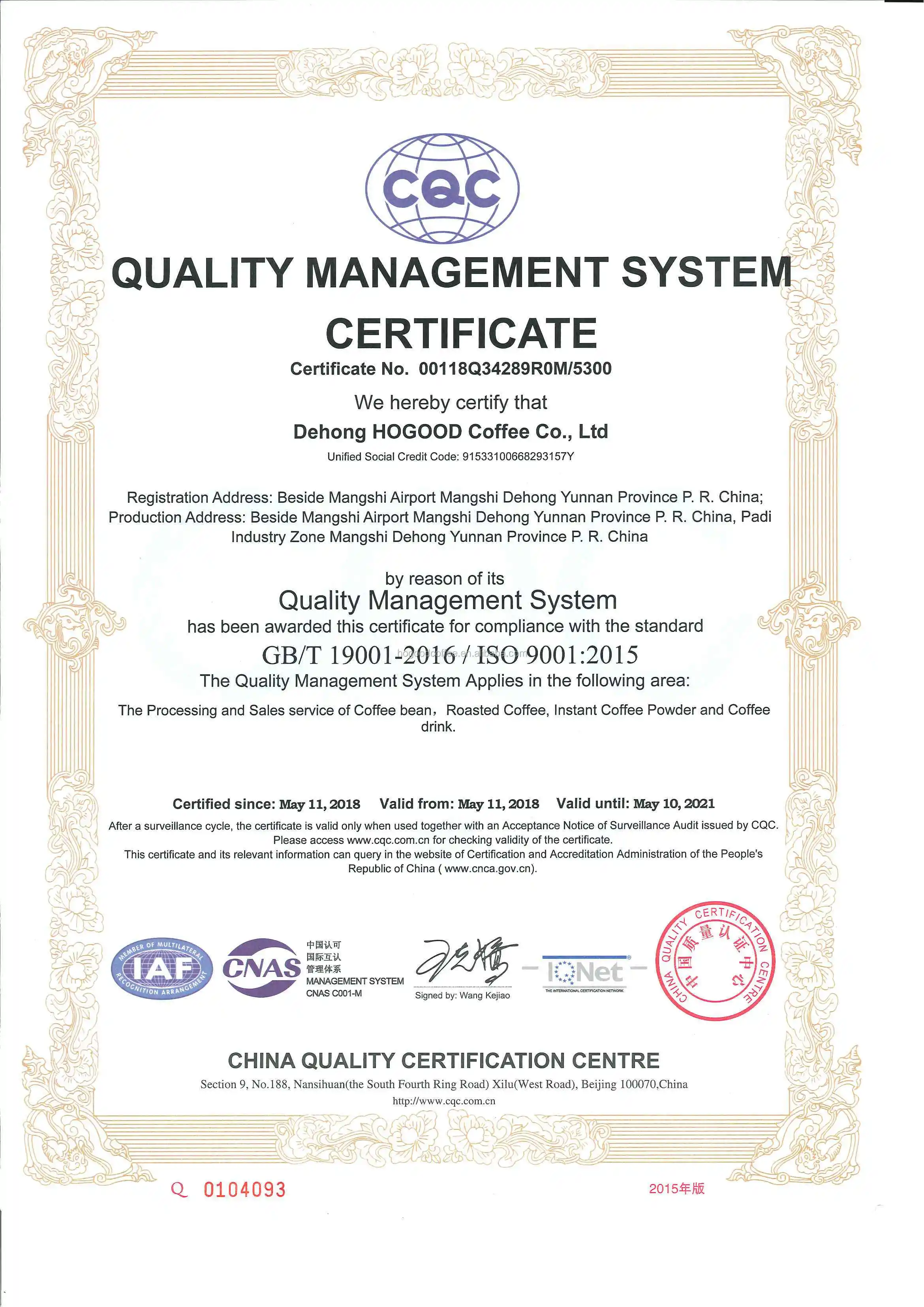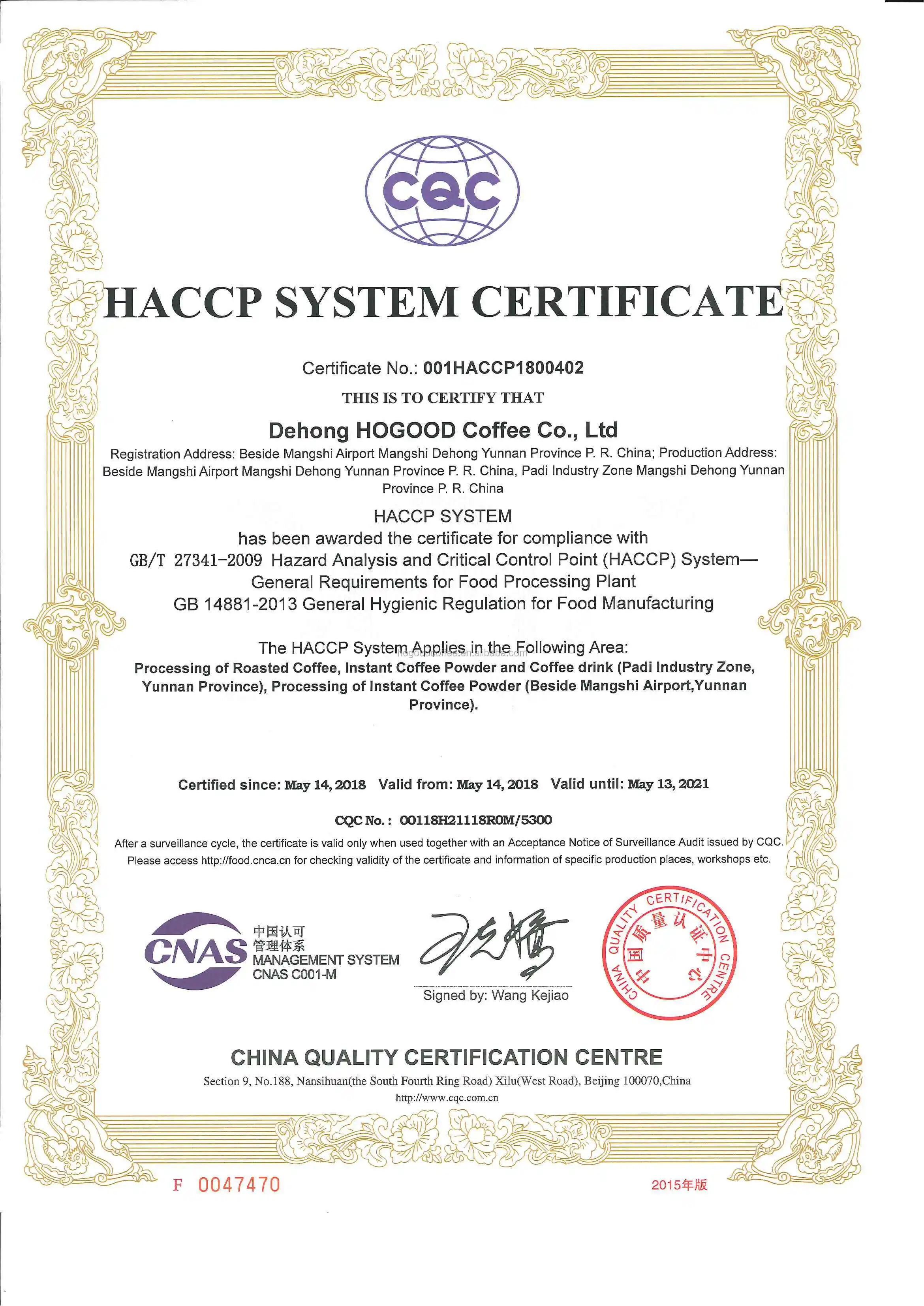 Raw Material: 100% Yunnan High Altitude Arabica coffee beans