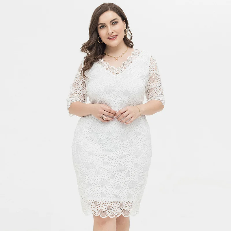 Модная одежда, вырез лодочкой, рукав до локтя, белая кружевная подкладка, бесшовное женское платье большого размера, женское белое кружевное вечернее платье