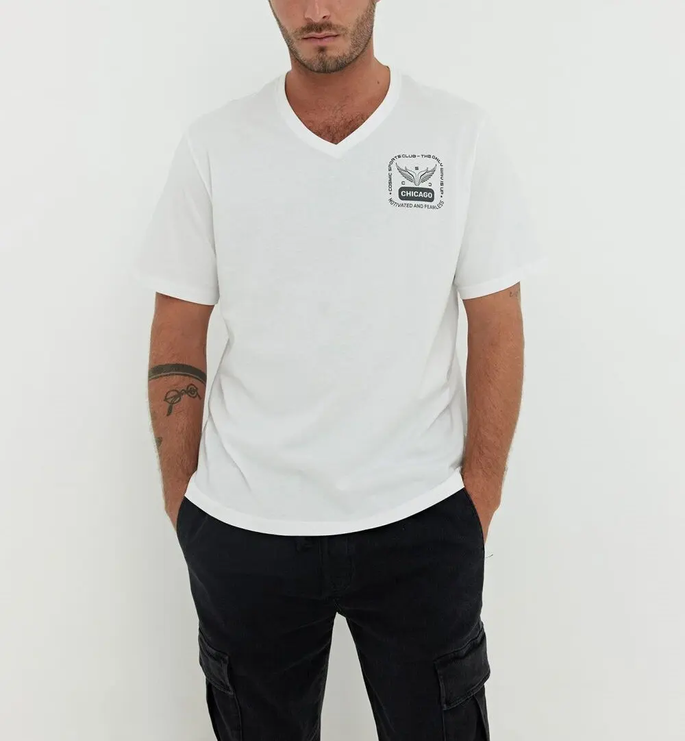 Мужская простая футболка с обычным принтом из качественной хлопчатобумажной ткани обычного кроя с V-клавишей и тонким текстовым принтом