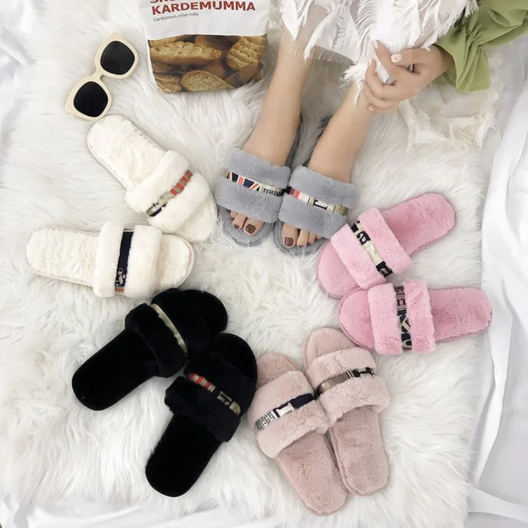 Сандалии женские с открытым носком плюшевые шлепанцы из искусственного меха Роскошные зимние сланцы блестящие ремнем мягкая подошва украшение для дома и