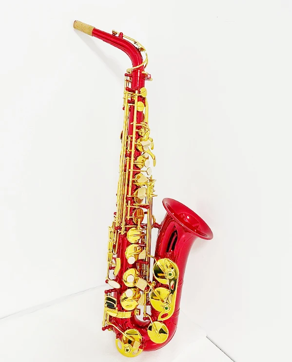 The alto saxophone is brass body, gold lacquer finish.
