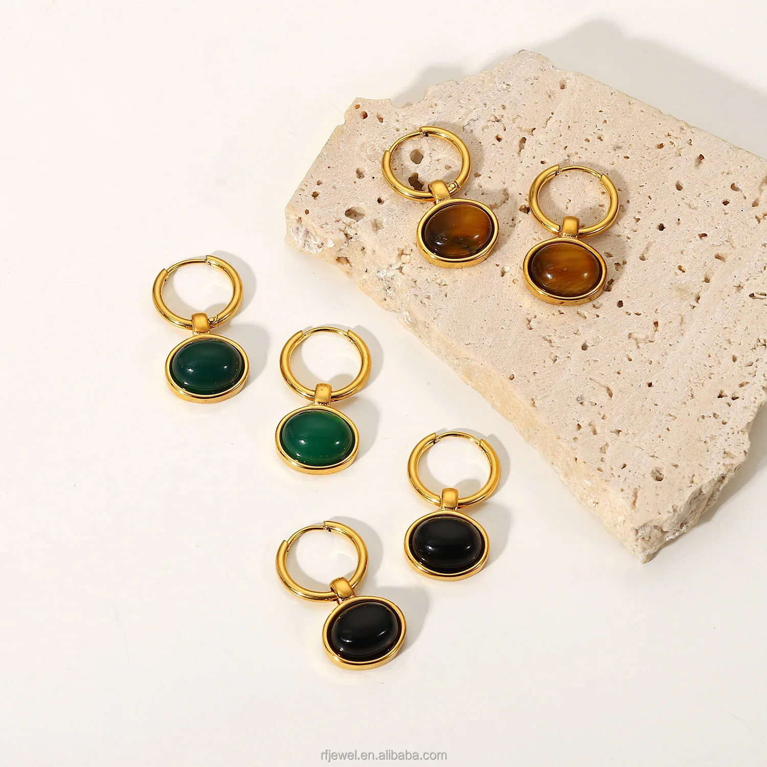 RFJEWEL Овальный натуральный тигровый глаз подвеска кольцо серьги 18K позолоченные из нержавеющей стали для женщин