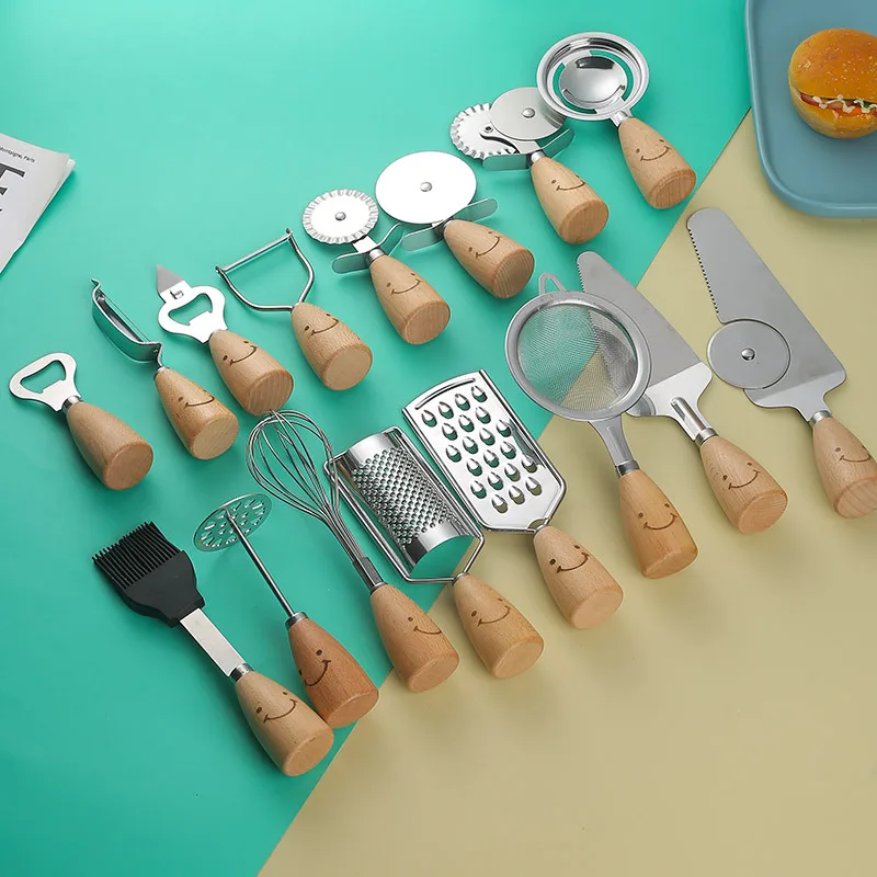 Деревянная короткая ручка портативные кухонные гаджеты со смайликом из нержавеющей стали взбивалка для яиц терка вилка пиццы