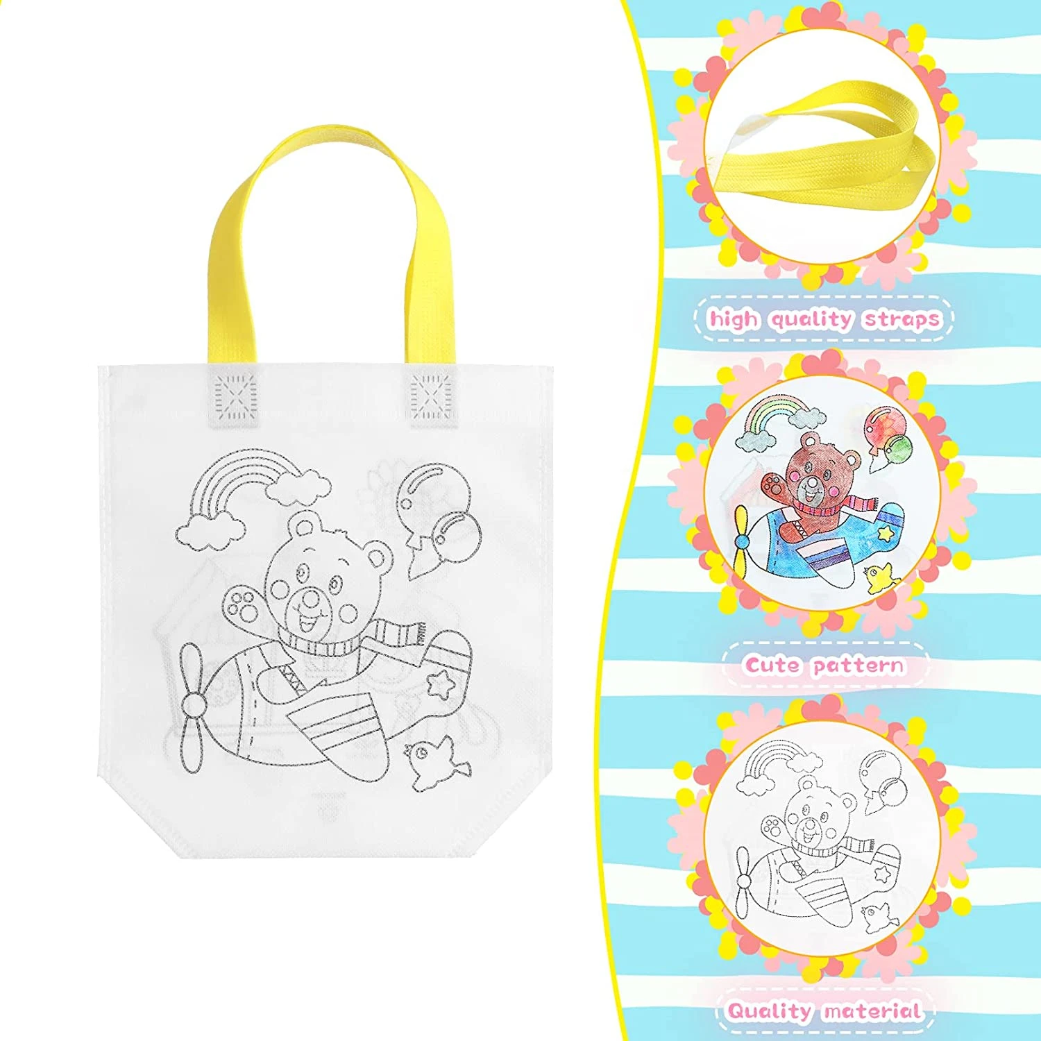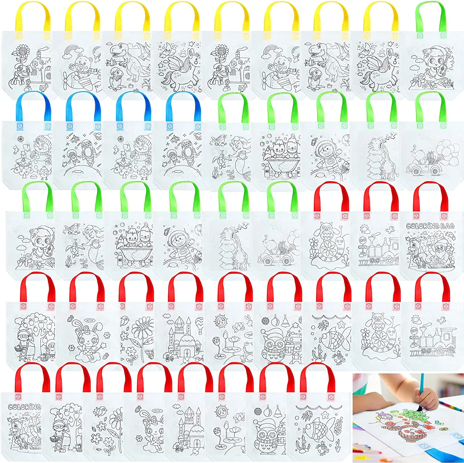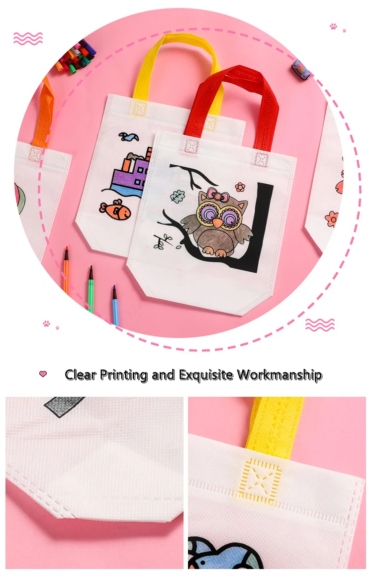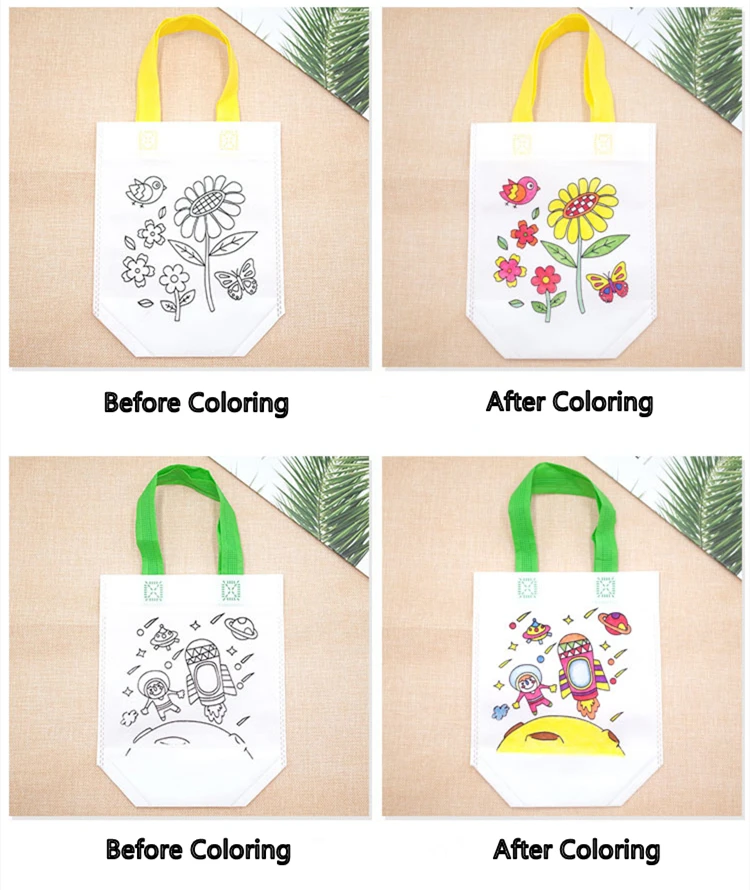 Friendly Material | The kids coloring tote bags are made of quality non woven material without unpleasant smell, reliable, safe and comfortable, they are printed with patterns, and not easy to fade or fray, serving for a long time. |