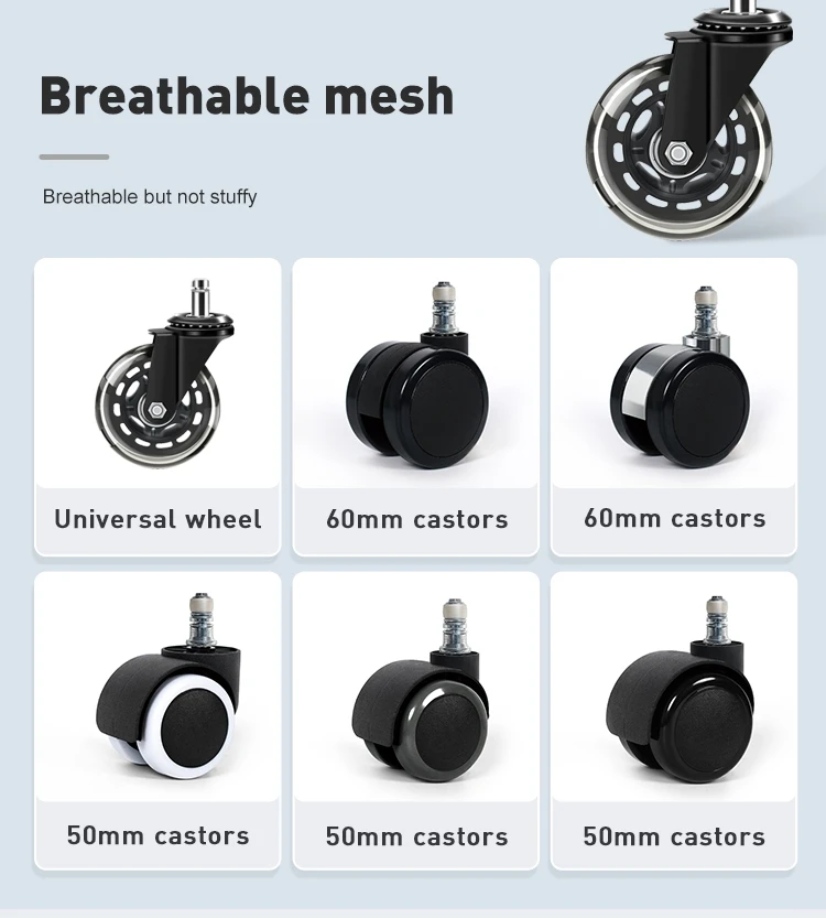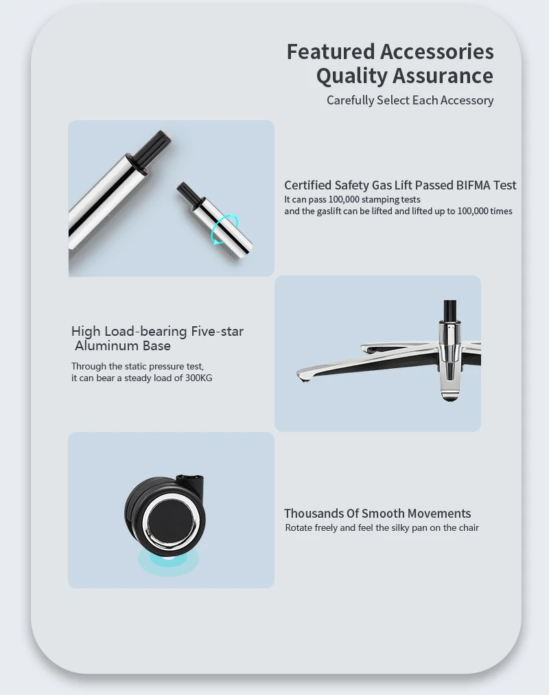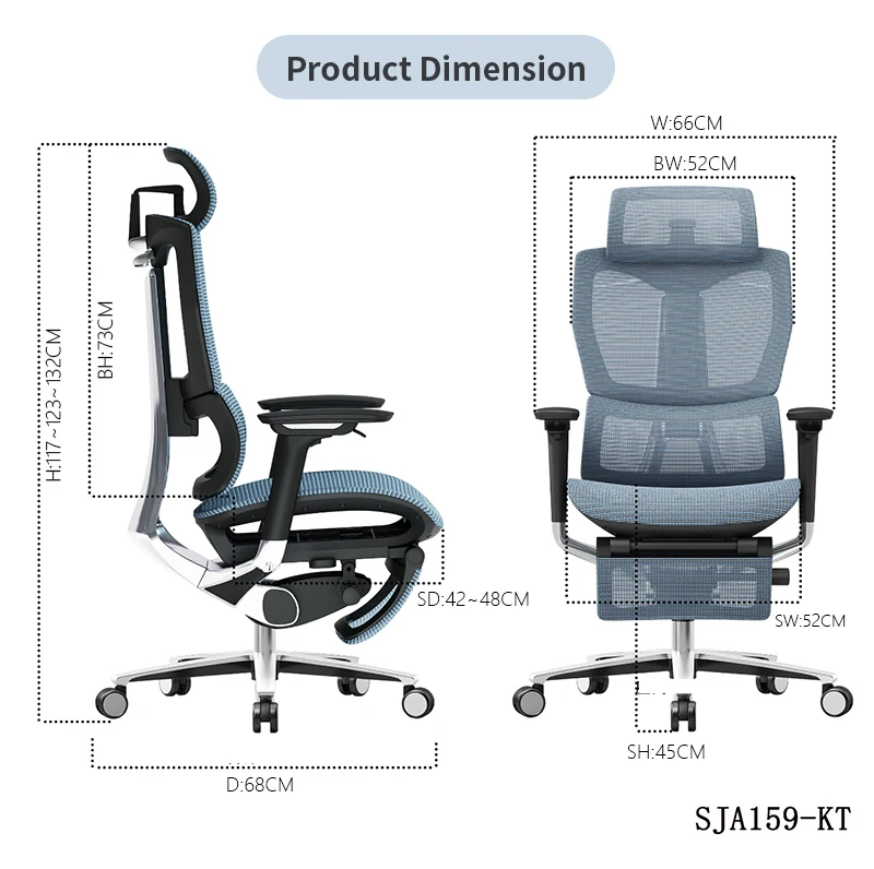 Features | 1. Adjustable 3D headrest +3D armrest 2. Nylon+GF lifted Backframe+adjustable lumbar support+coat hanger 3. Full mesh design+ Seatslidable+footrest 4. Functional wire-controlled mechanism 5. Class 4 gaslift 6. Aluminum base can be passed 1136KG static pressure test 7. PU castors BIFMA test passed |