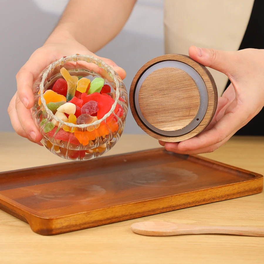 Многообъемная Вертикальная полосатая стеклянная банка в форме гусениц воздухонепроницаемая волнообразная для хранения с деревянной крышкой
