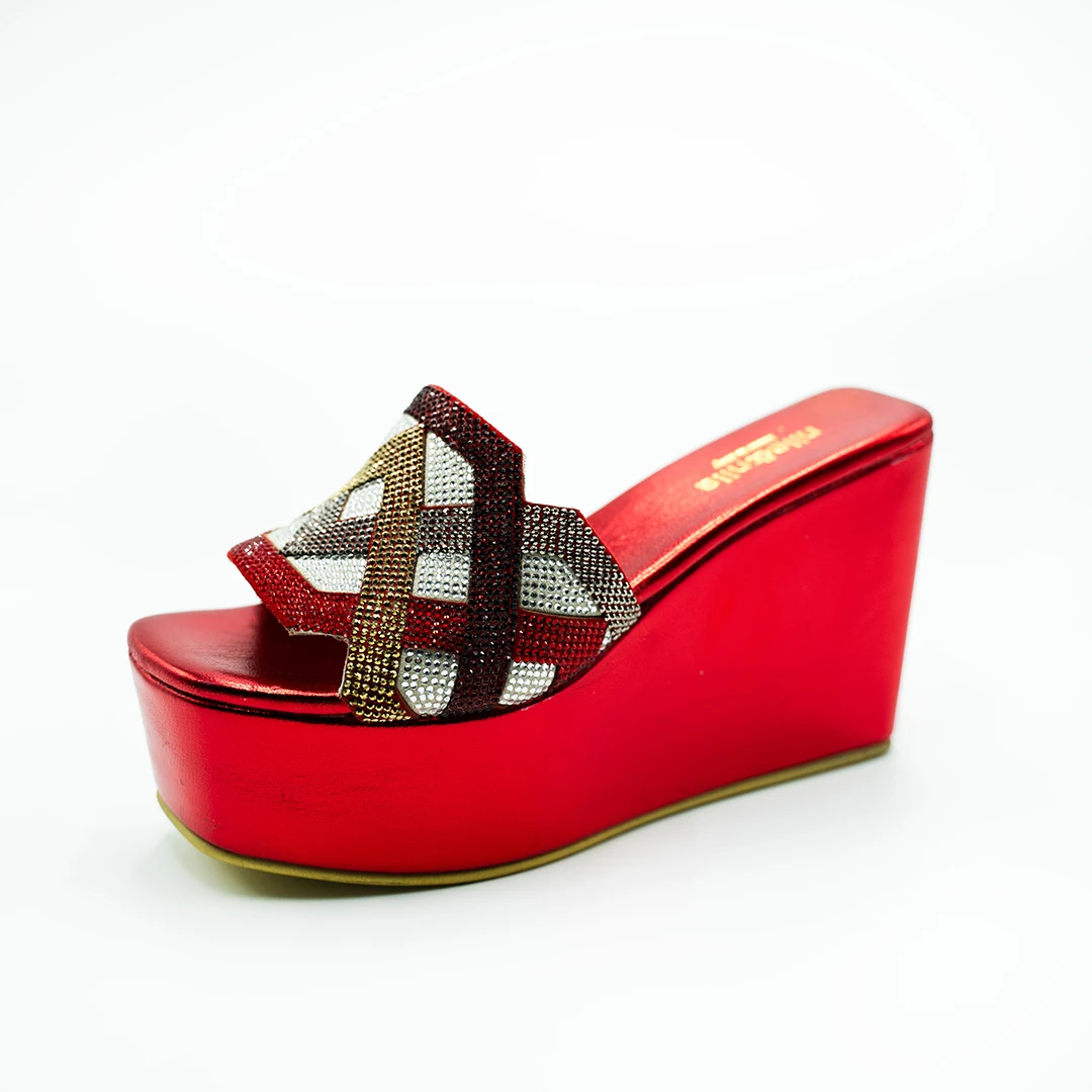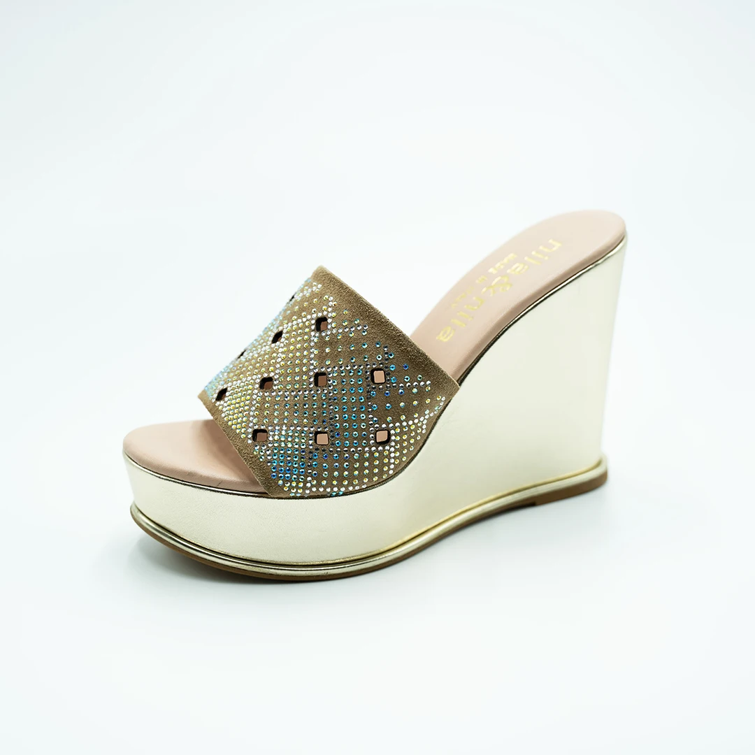 Женские босоножки на танкетке с разноцветным ламинированным покрытием из стразовой кожи клиновидной 100