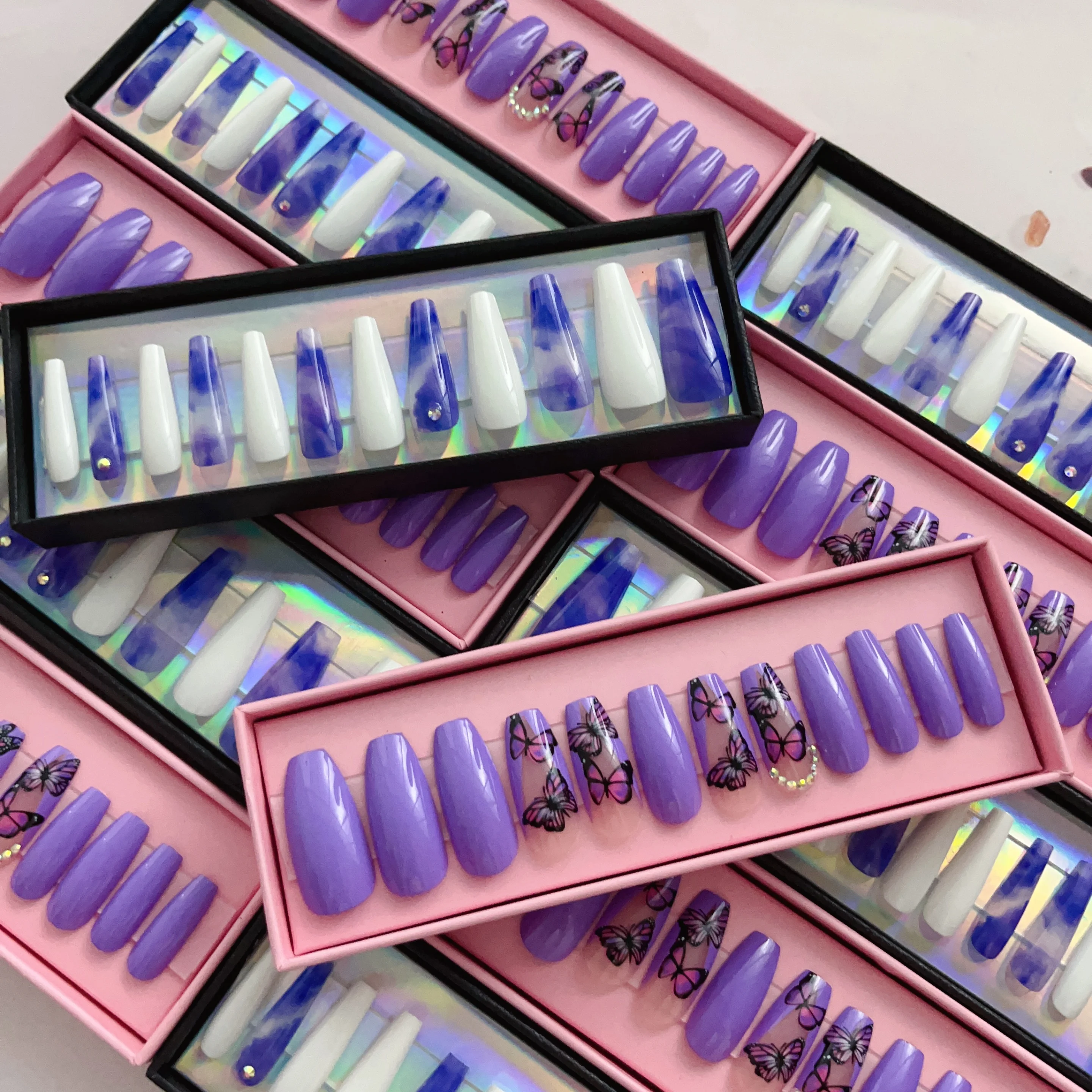 Private label detachable black french flame press on nails custom red paillette false nail coffin long curve artificial nails