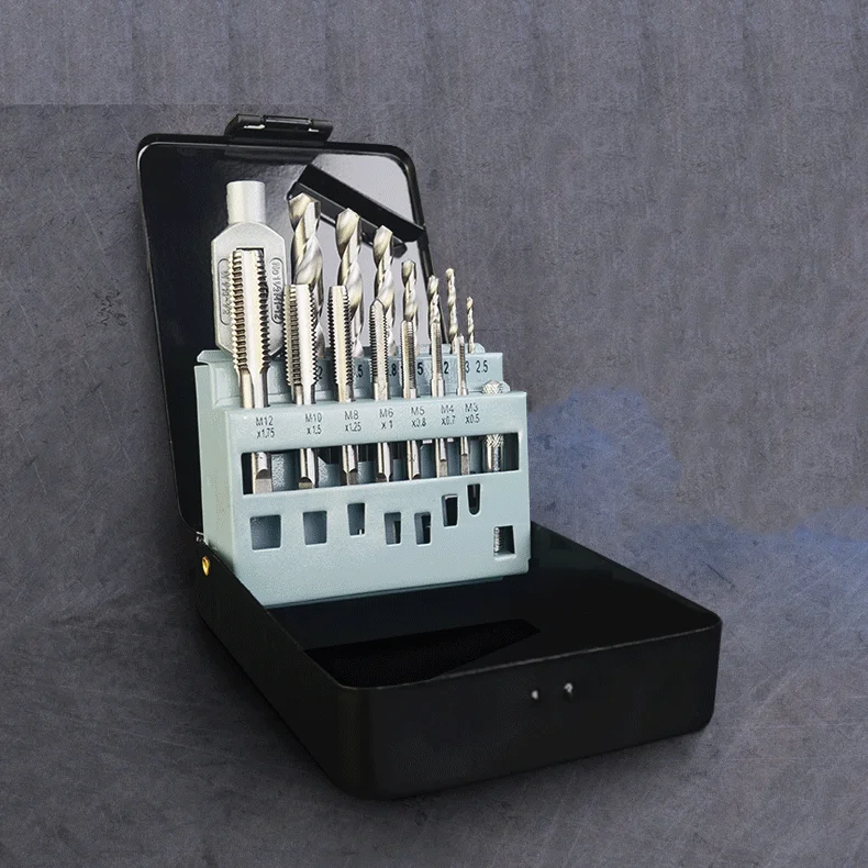 16PC dies sizes: 3×0.5, 3×0.6, 4×0.7, 4×0.75, 5×0.8, 5×0.9, 6×1.0, 6×0.75, 7×0.75, 7×1, 8×1.25, 8×1.0, 10×1.25, 10×1.5, 12×1.75, 12×1.5 NPT die size:1/8-27 16PC taps:size as dies NPT tap size:1/8-27 1PC Tap wrench 1PC Die handle:1"OD 1PC T Type Tap Wrench 1/4" capacity Screw-pitch gauge |
