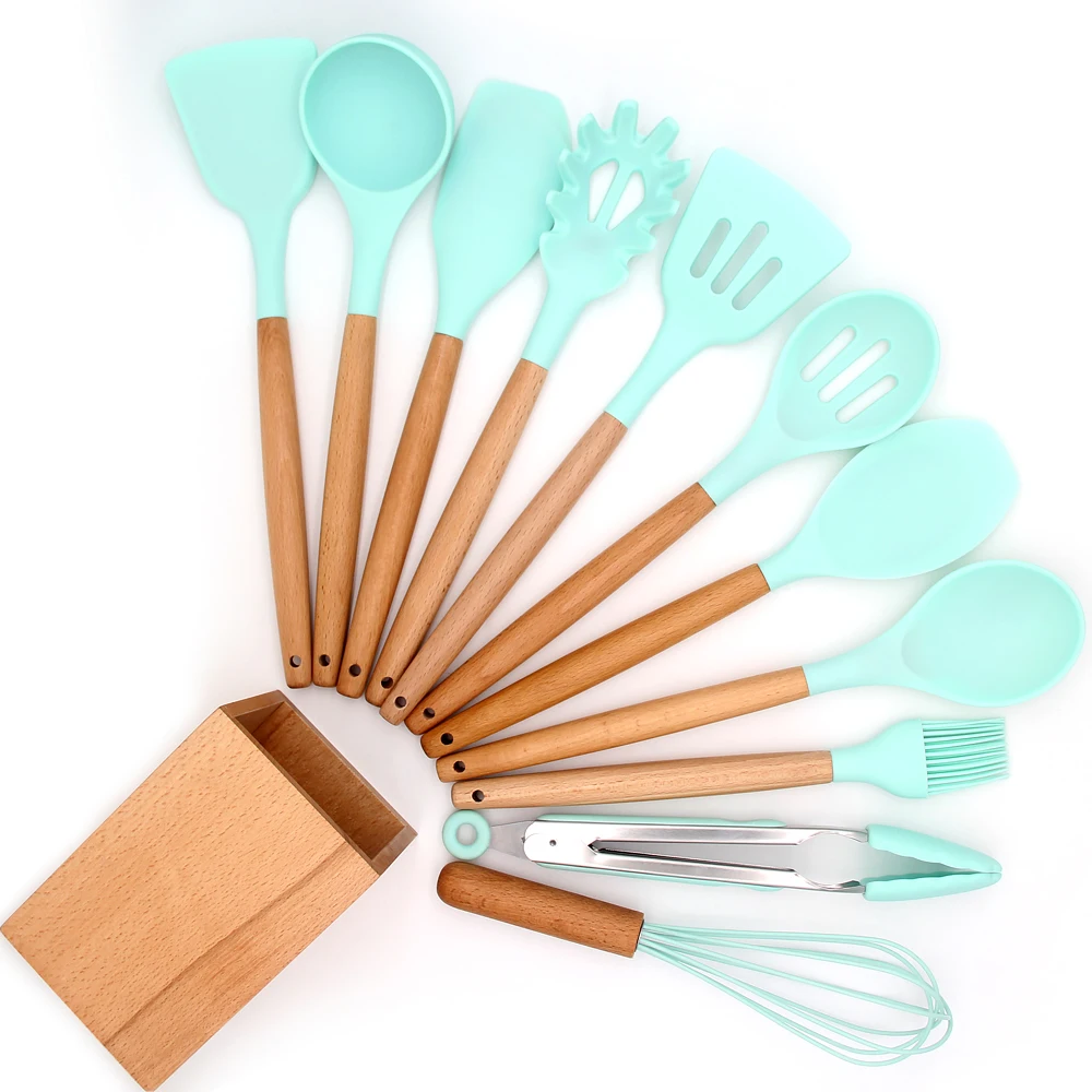 Бамбуковая кухонная утварь набор столовых приборов 30 см Силиконовая бамбуковая Ложка Вилка лопатка противоскользящая термостойкая силиконовая ручка