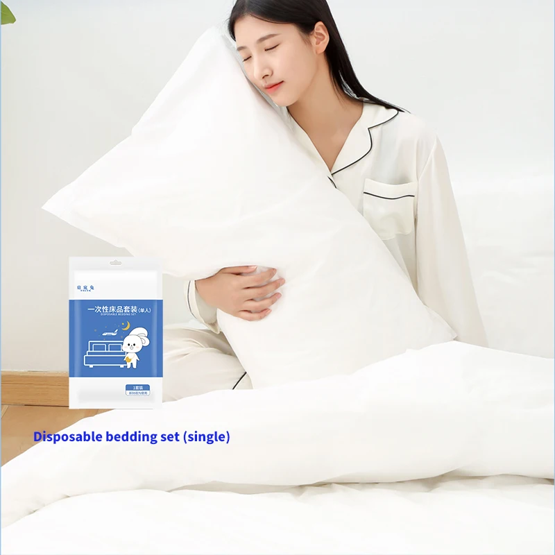 Одноразовые постельные принадлежности с логотипом на заказ, оптовая продажа, костюм для путешествий, роскошное нетканое одеяло, стеганое постельное белье, набор из трех предметов
