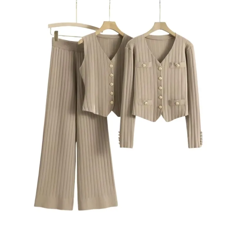 2024 Новый стильный однотонный комплект из 3 предметов для женщин кардиган с V-образным вырезом брюки-майки повседневный вязаный свитер украшение на пуговицах зима
