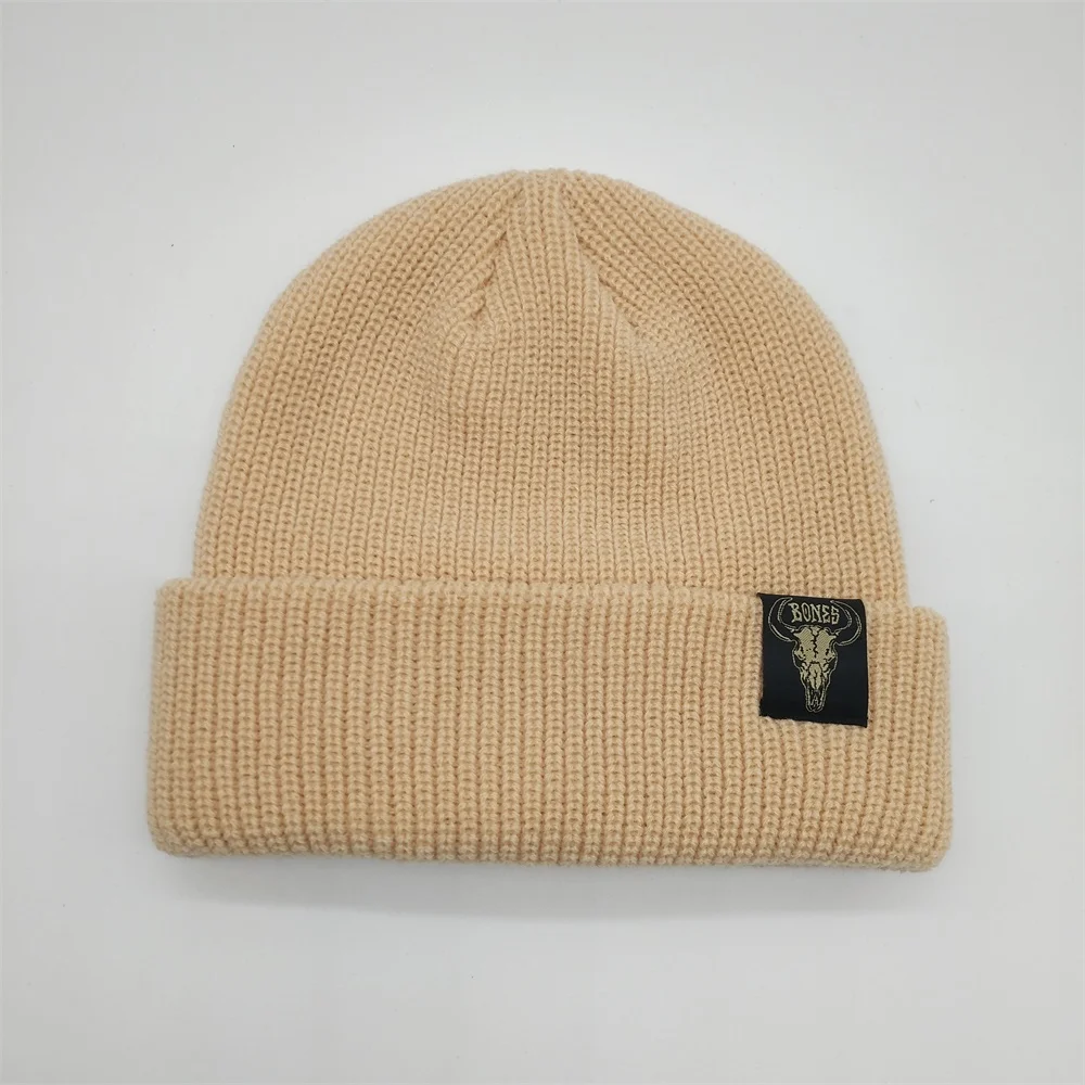 Оптовая продажа, двухцветная вязаная шапка из акриловой шерсти с дизайнерским логотипом, однотонная вязаная зимняя теплая шапка с черепом для ежедневной рыбалки