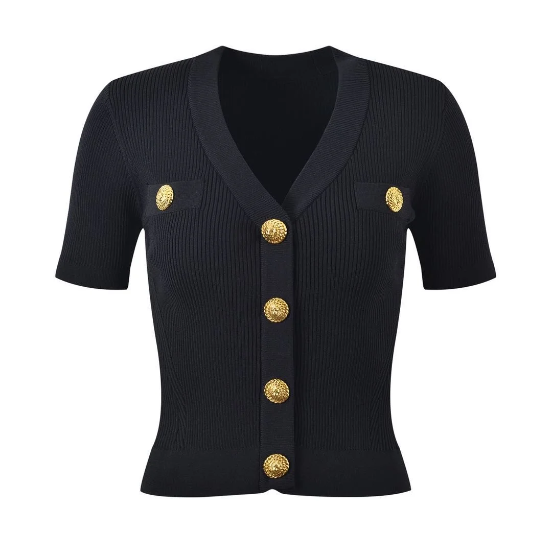 Французский стиль маленький аромат V-образным вырезом однобортный Топ с короткими рукавами 2024 лето новый модный универсальный короткий вязаный кардиган
