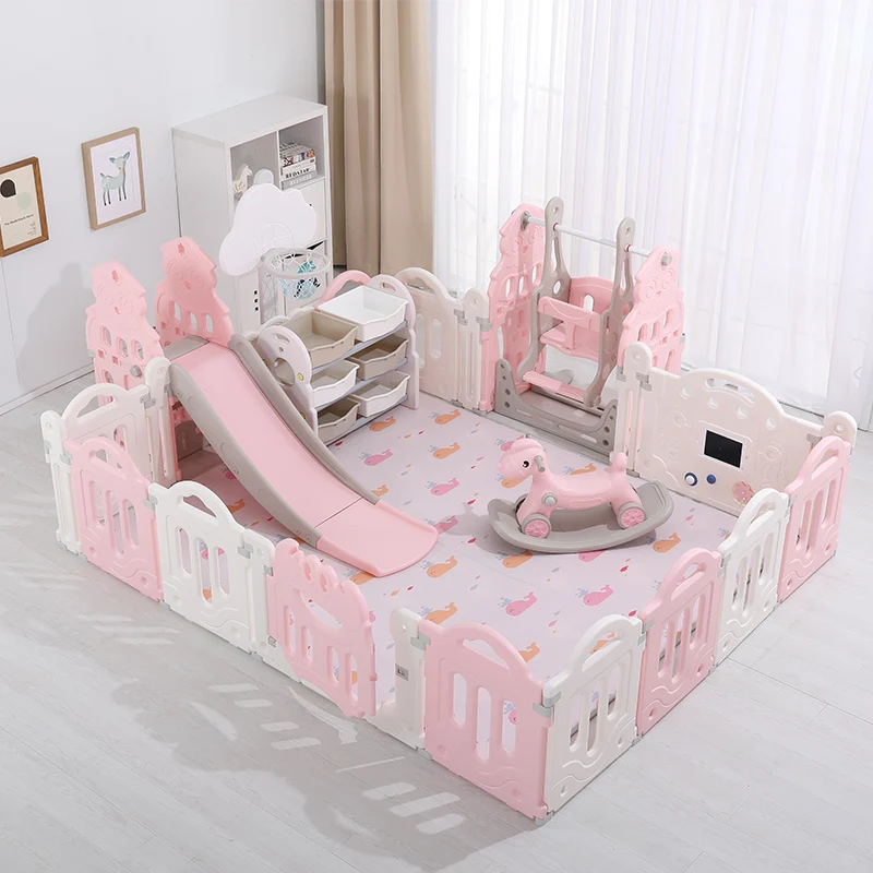 The safety gate with double lock definitely provides a safe playing area. The baby playpen also has a TPR carriage bag behind the door to collect child's toys or other important necessities.