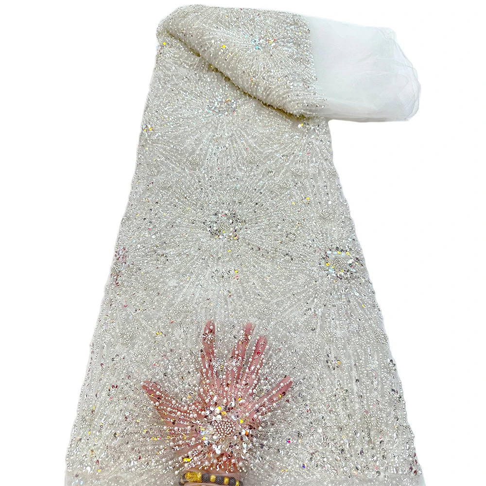 African lace fabric beads fabric handmade tulle lace with sequins for evening dress for party/wedding