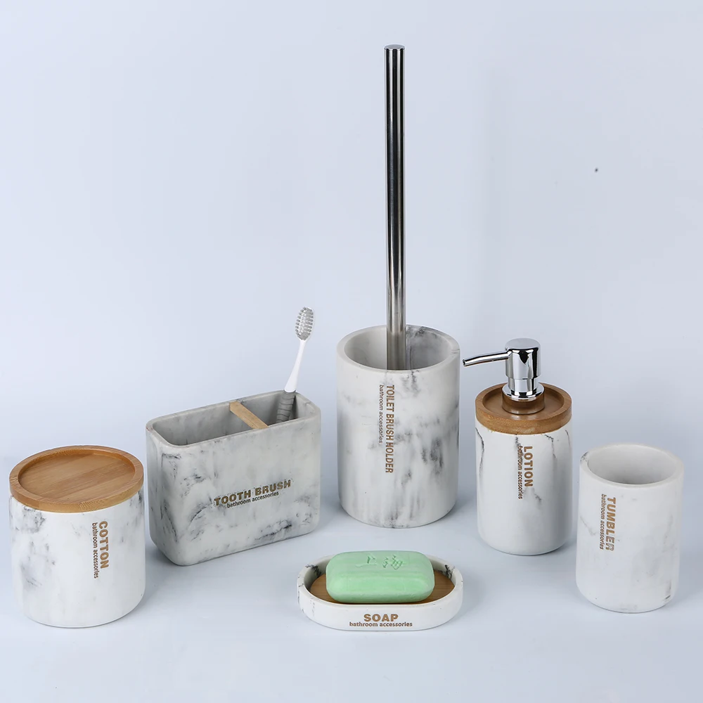 Роскошный современный дизайн набор аксессуаров из полирезина и мрамора для ванной комнаты 6 предметов мраморной древесной стружки отеля наборы с деревянной крышкой