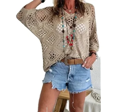 2024 летний модный пикантный однотонный ажурный бикини с V-образным вырезом пляжный трикотажный пуловер для отдыха женщин 973,76 ₽ - 1 100,73 ₽