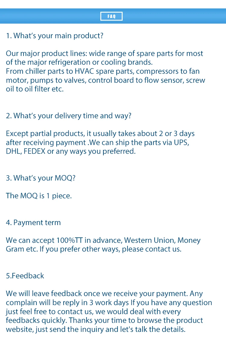 1. What’s your main product? Our major product lines: wide range of spare parts for most of the major refrigeration or cooling brands. From chiller parts to HVAC spare parts, compressors to fan motor, pumps to valves, control board to flow sensor, screw oil to oil filter etc.
