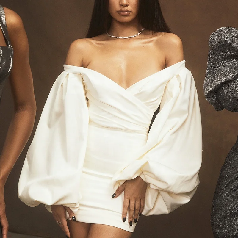 Атласные мини-платья с открытыми плечами и длинным рукавом-фонариком облегающее женское короткое вечернее платье запахом на бедрах открытой